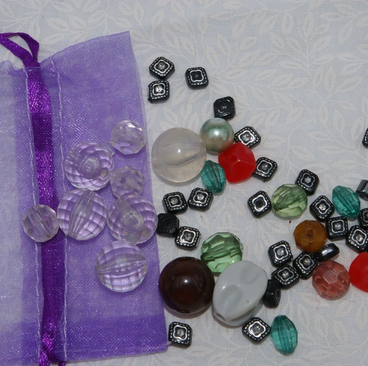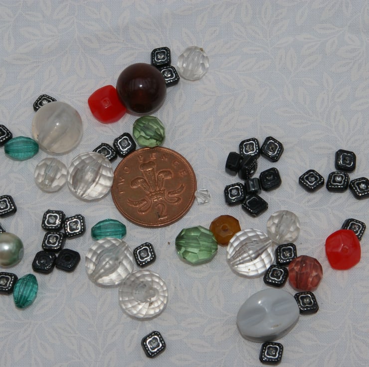 A bag of mixed acrylic beads. This is a de stash bag of assorted sized and colour acrylic beads. Mainly clear, black and green in colour.