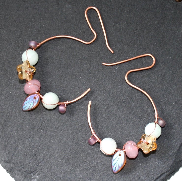 The delicate pastel colours in these earrings remind me of a spring flower garden. The glass beads are wire wrapped around bare copper hoops that are hand formed from one piece of wire in an unusual design.
