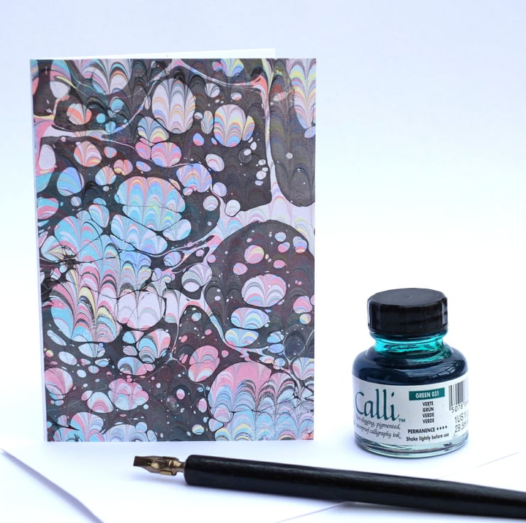 This is an unusual overmarbled note card with a lovely rainbow non pareil pattern underneath an Italian vein done in black. The card was created by going through the marbling process twice which makes it extra unique!