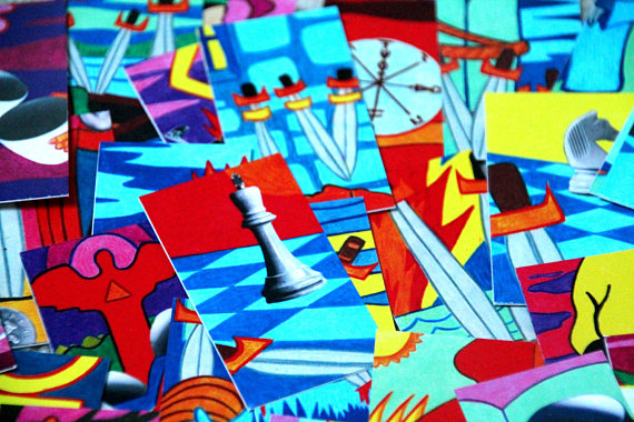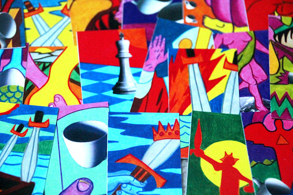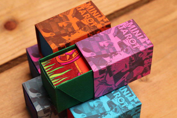 Printed reproductions of a handmade set of a Pop Art inspired and modern looking Tarot cards, in a handmade box.