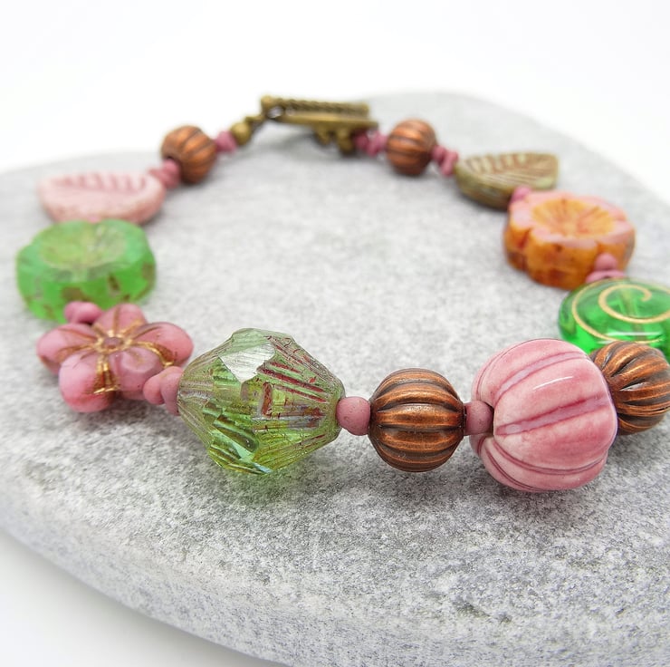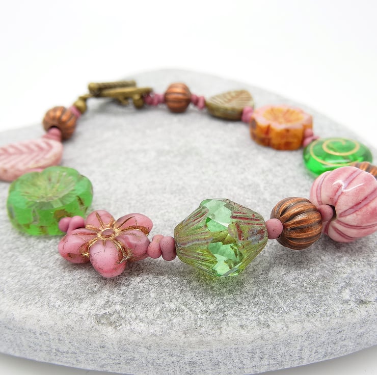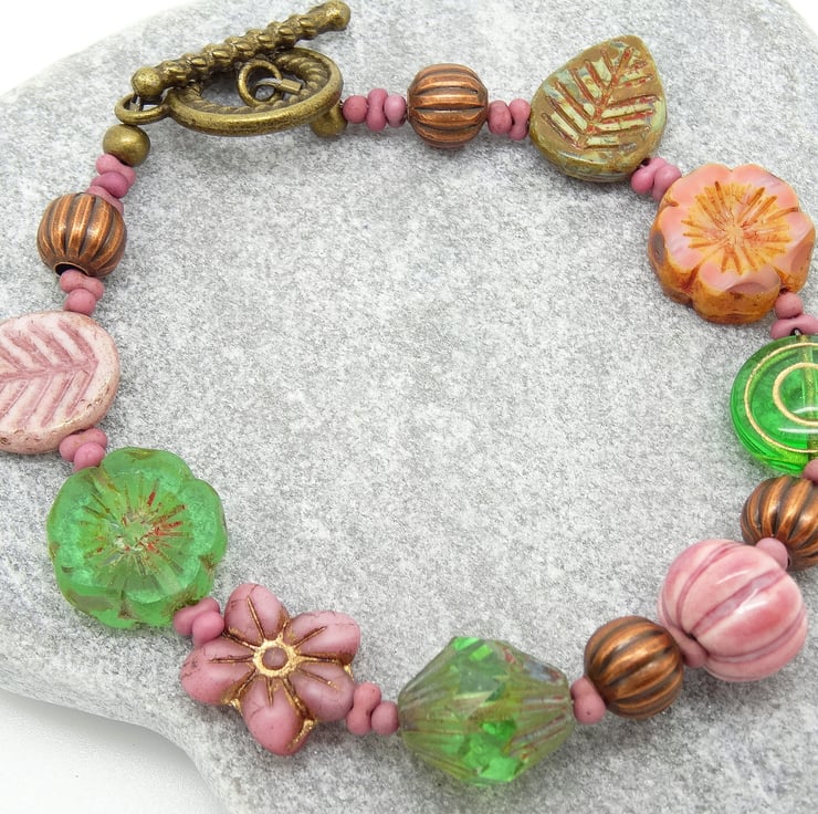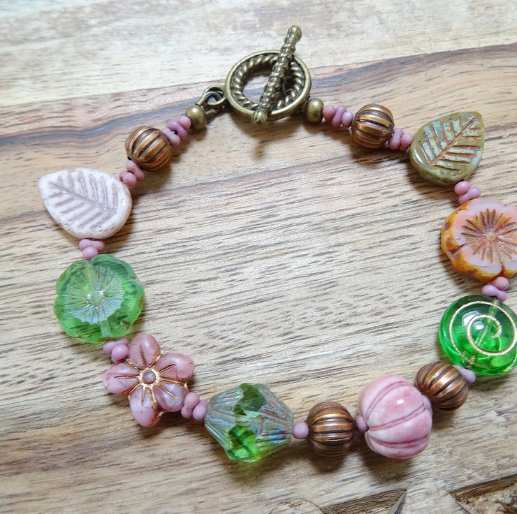 This is a lovely bracelet made entirely with czech glass, table cut beads. These include 14mm pansy flower beads, 12 x 13mm daisy beads, 15mm leaf beads and a large bicone and ceramic pumpkin bead. These are interspersed with czech glass peanut beads and the colours are apple green and dusky pink. The bracelet measurement is 8.25 inches (21cm) and closes with a antique bronze coloured toggle clasp.