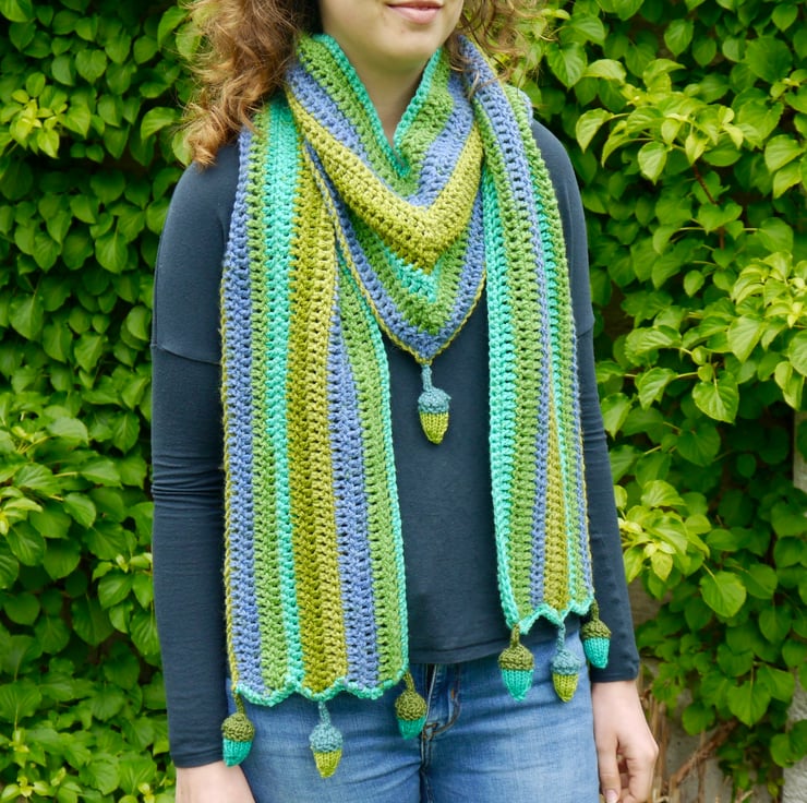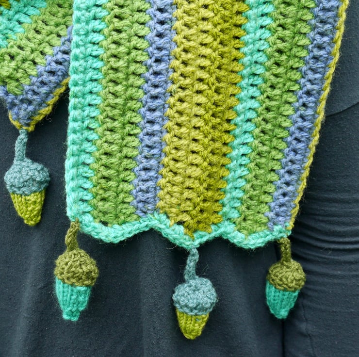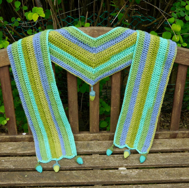 The scarf is 'V' shaped and can be worn with the 'V' at the front or looped around the shoulders. I have crocheted this scarf with a lovely chunky self striping yarn. It measures approx 110cm from centre point to end of acorns, which is one half of the scarf. The width is approx 18cm.