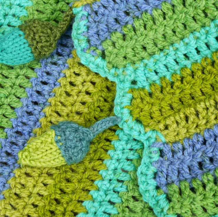 An exciting stripy crochet scarf in shades of turquoise, blues and greens.