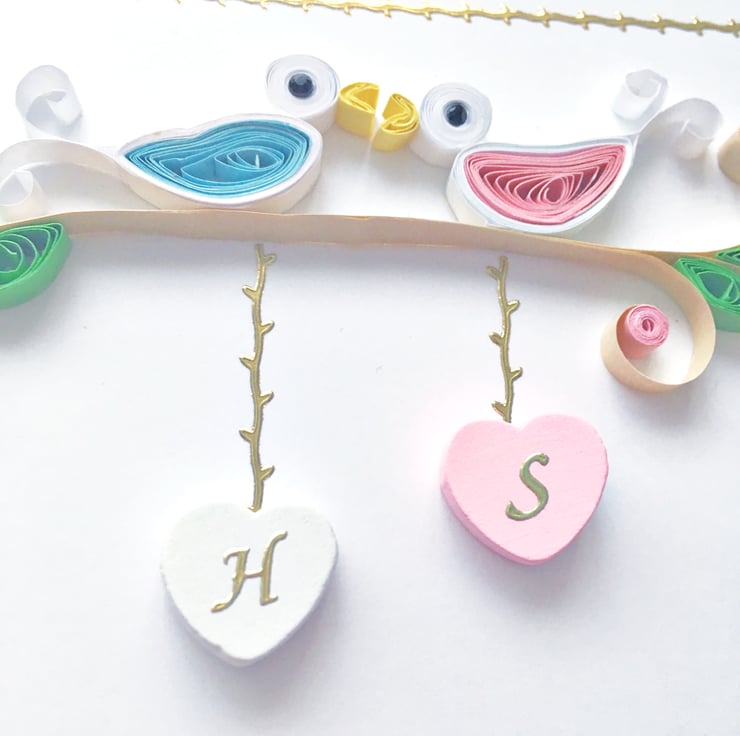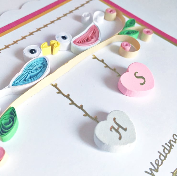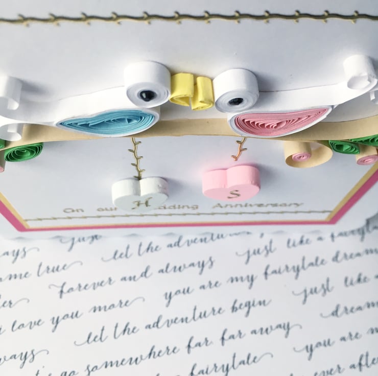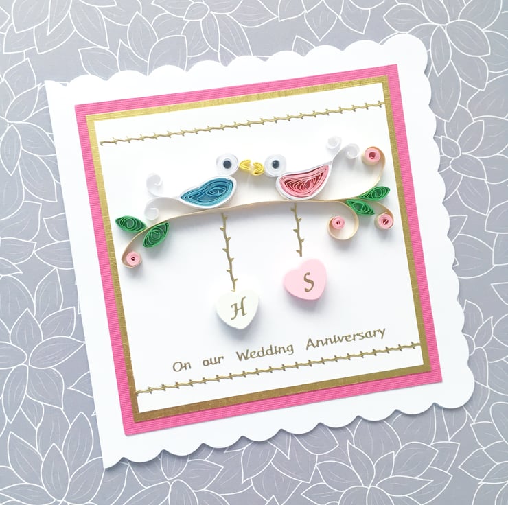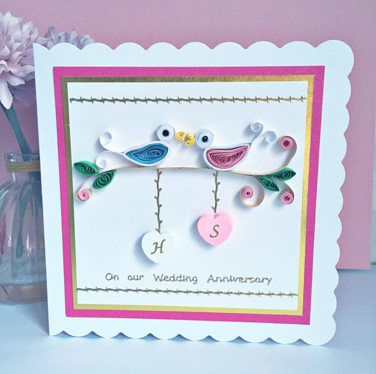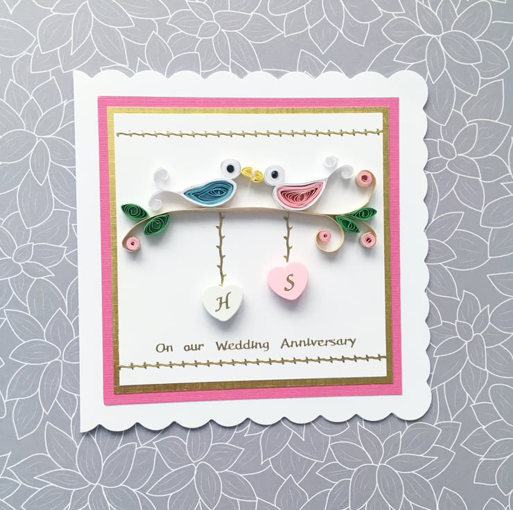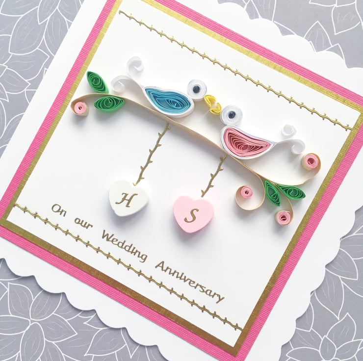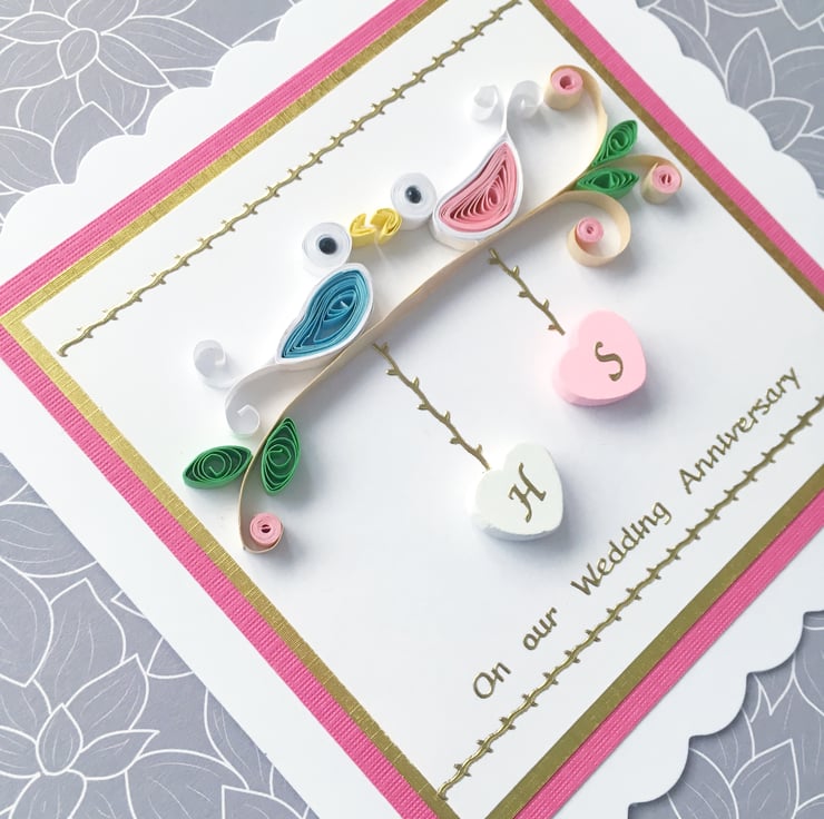 A beautiful quilled card featuring a pair of lovebirds to celebrate a wedding anniversary.