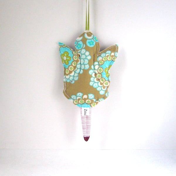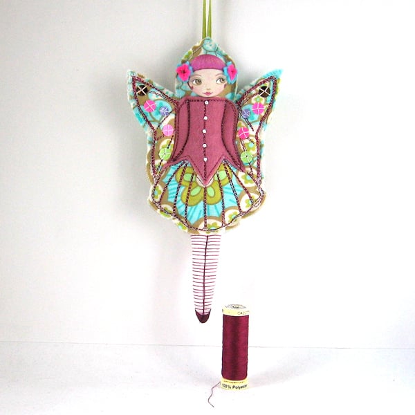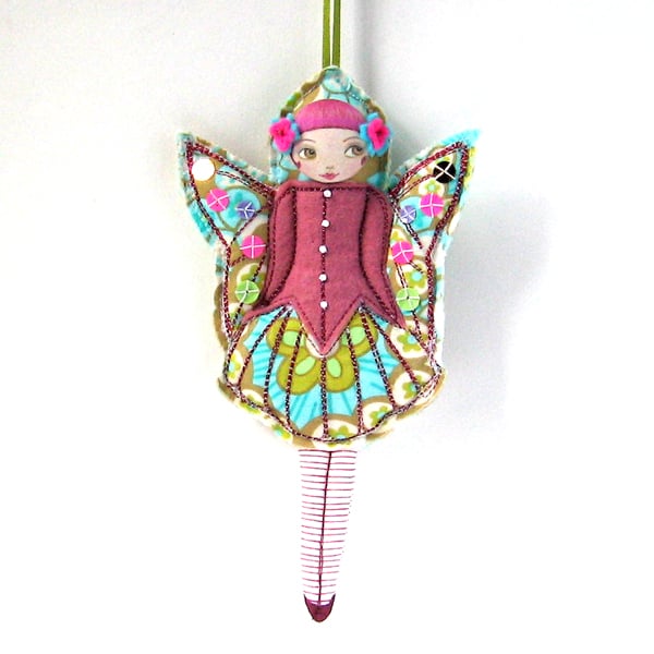 It hangs from a green ribbon, is a mixed media piece and has been handmade from good quality cotton fabric, dark pink felt, machine embroidered with glittery pink and white threads and hand beaded with sequins (which glitter when they hit the light). She has been finished off with one of our little Cecile doll face buttons (which are also available here in our Folksy shop).