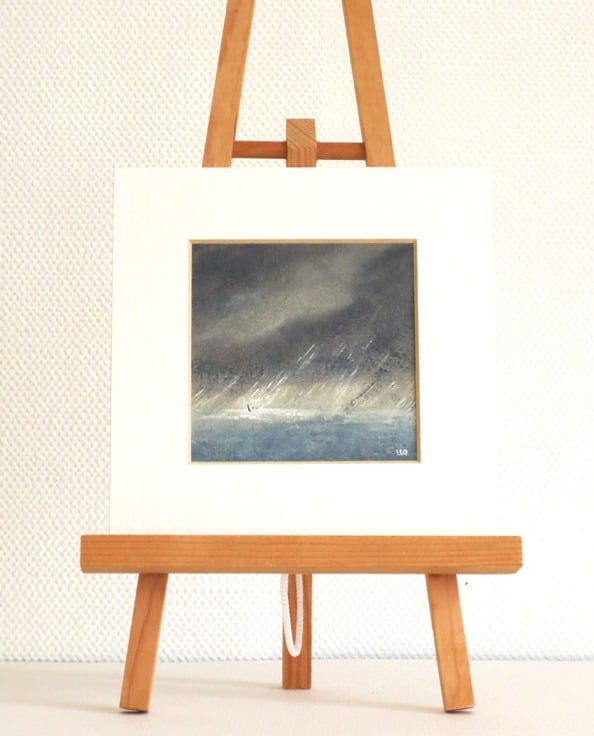 An original painting of a storm across the bay with yachts sailing. This small acrylic miniature painting measures 9x9cm (approx 3.5x3.5inch). The exterior of the mount measures 15.5x15.5cm (6x6inch).
