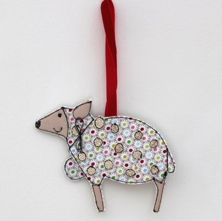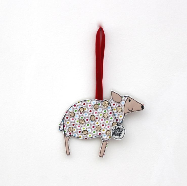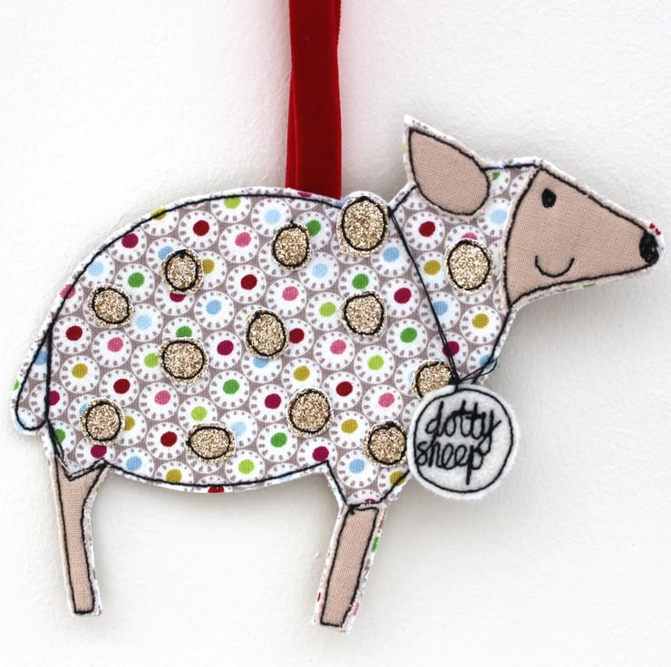 'Dotty sheep' is handmade using printed fabric, plain cotton cloth face and legs, glitter gold dots, a sewn 'dotty sheep' label and a red velvet ribbon to hang.