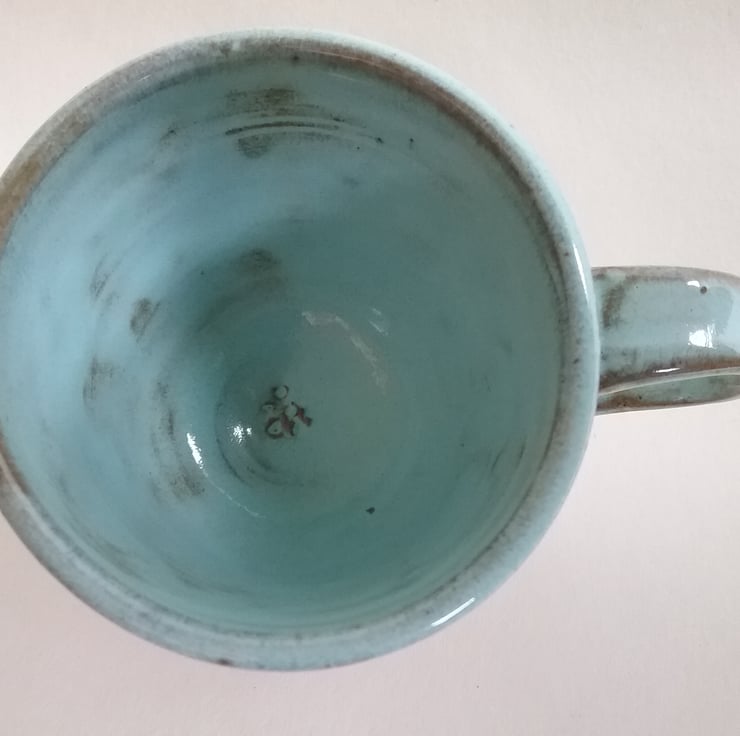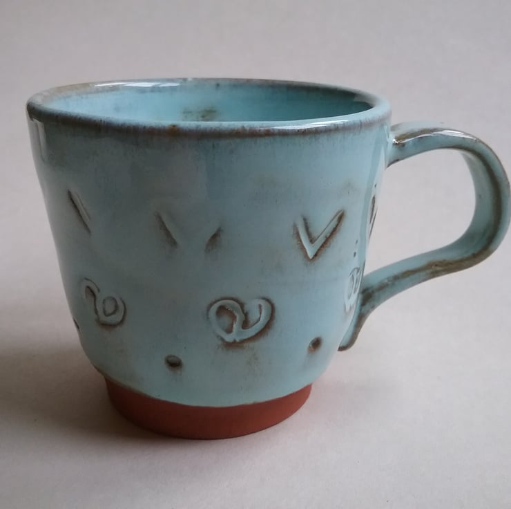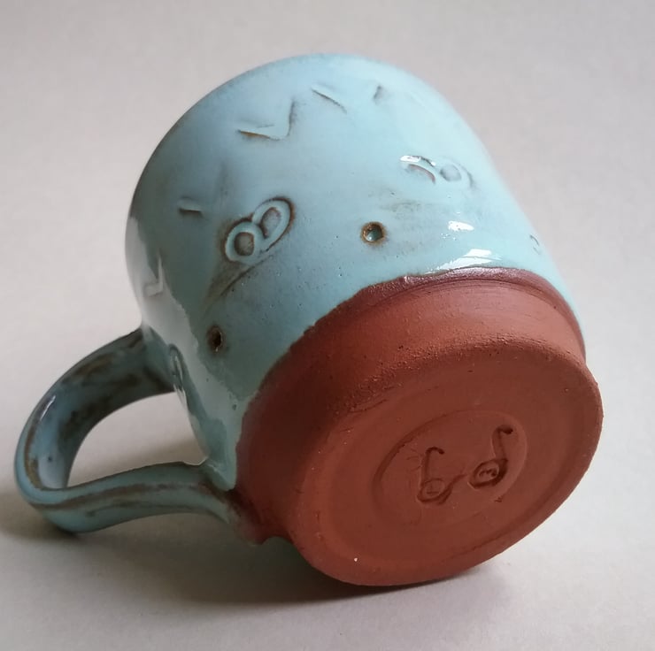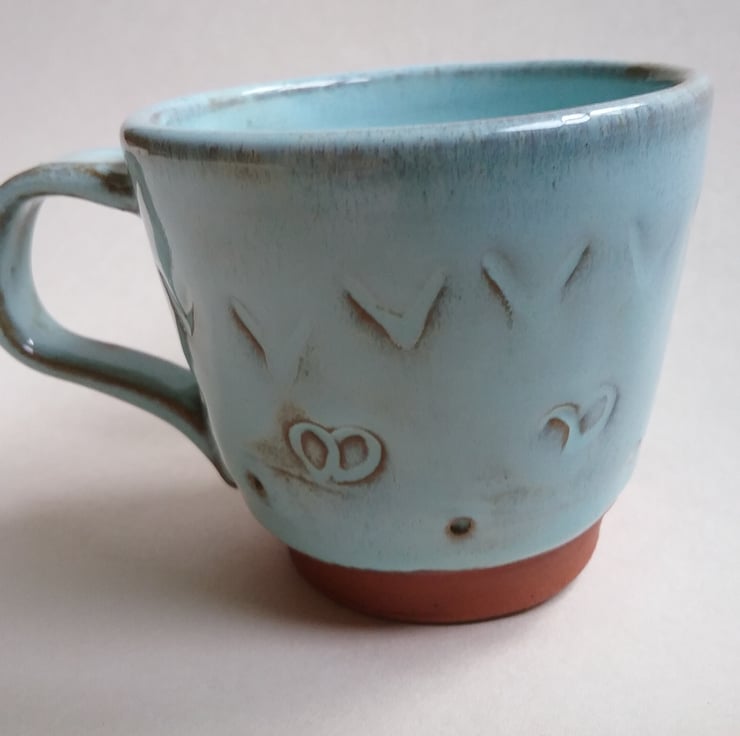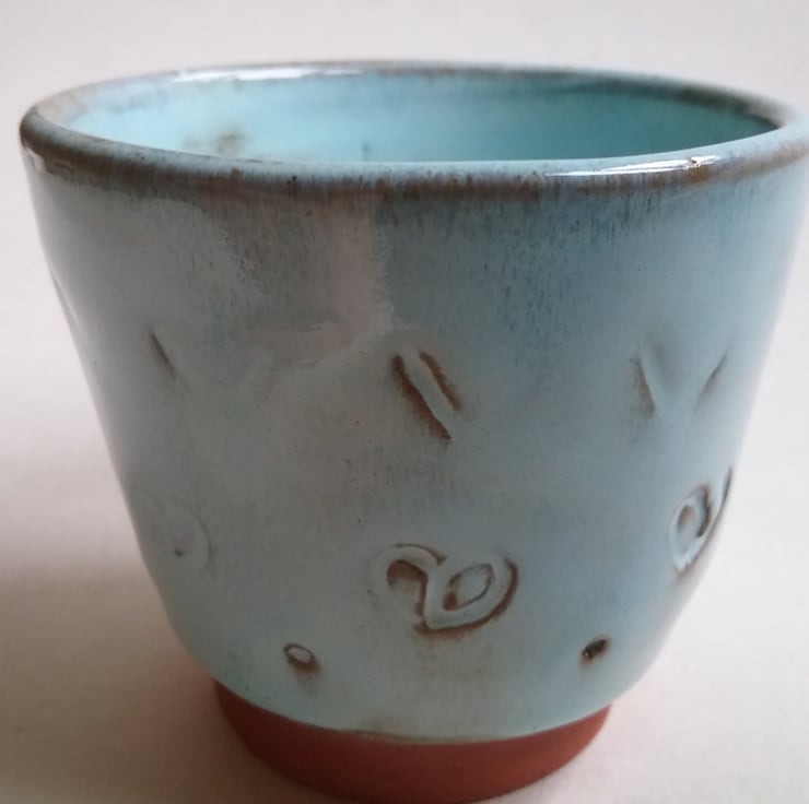 This little handmade terracotta espresso mug was hand thrown on my potter's wheel and the decoration was hand pressed into the clay. The cup was then bisque fired, a pale aqua blue glaze applied and fired again.