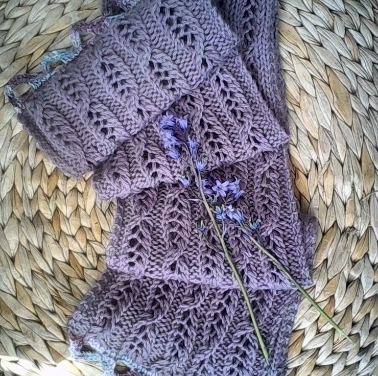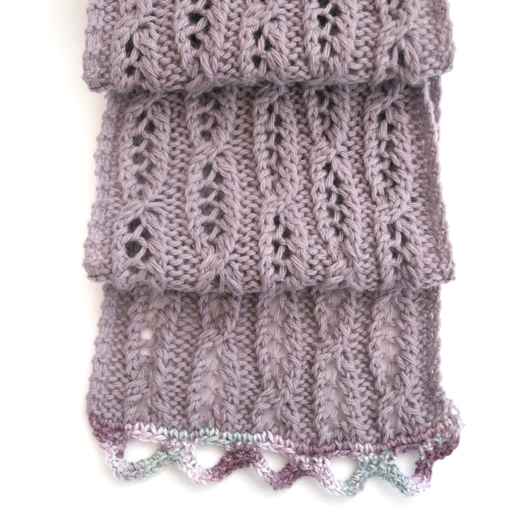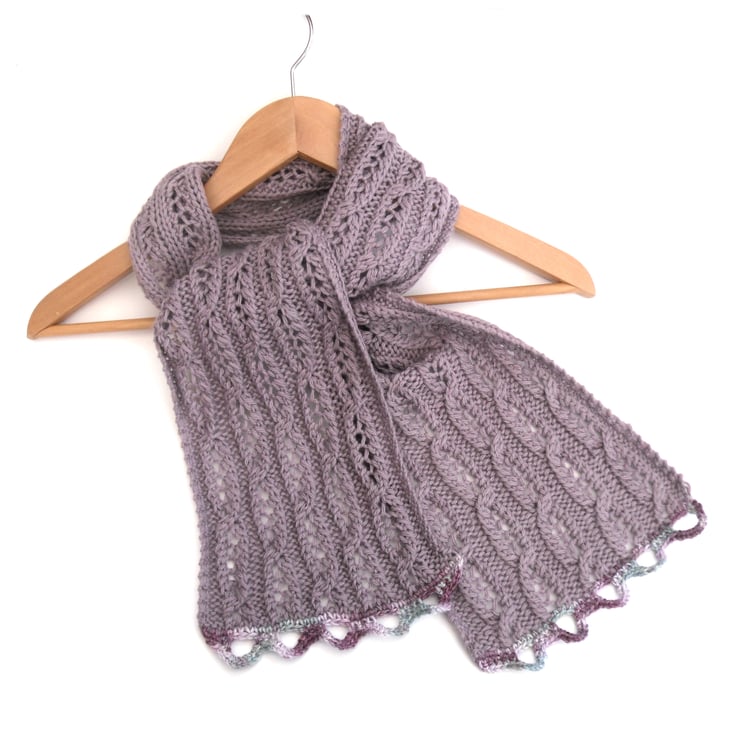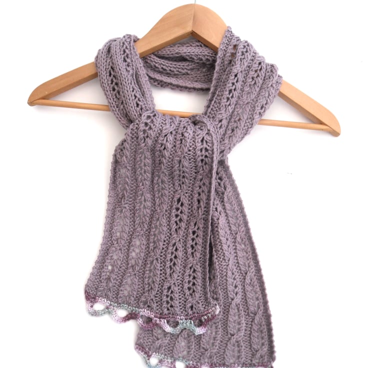 Beautifully soft autumn scarf. Ideal for those times when you want something to scrunch and tie round your neck and not have to worry about those dangly ends. Its been hand knitted in a lovely pretty cable lace pattern which gives it a layer of texture.