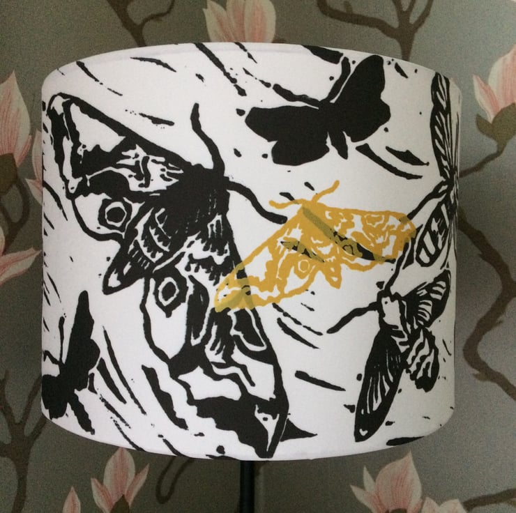 This is the smaller version of my Moths lampshade, suitable for a table lamp, wall light or ceiling shade for a small room. It is professionally printed on wipeable canvas with hand-printed accent gold moths. The height of this shade is 18.5cm. It will be sent carefully packaged, winging its way in first class post in a sturdy box within 14 days or sooner.