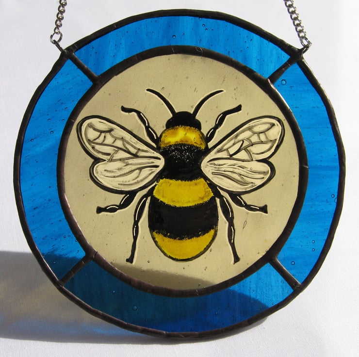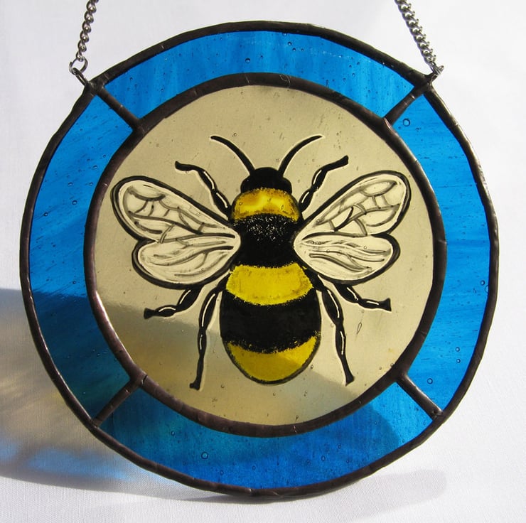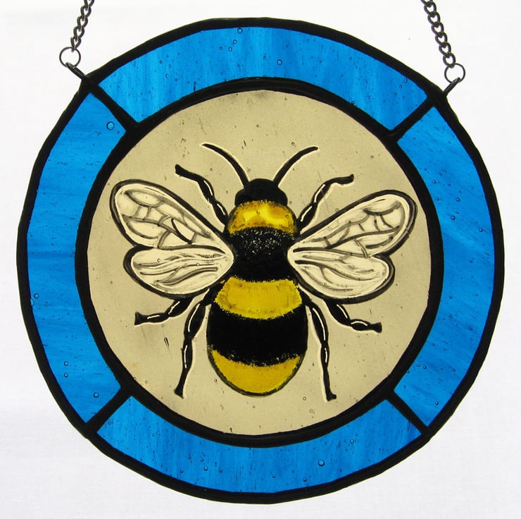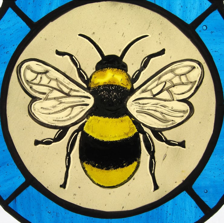 Created using traditional stained glass techniques and materials this bumblebee image has been hand painted onto light amber, antique style glass and fired in a kiln at high temperature making the image permanent and enduring.
