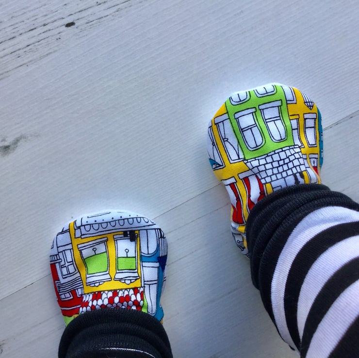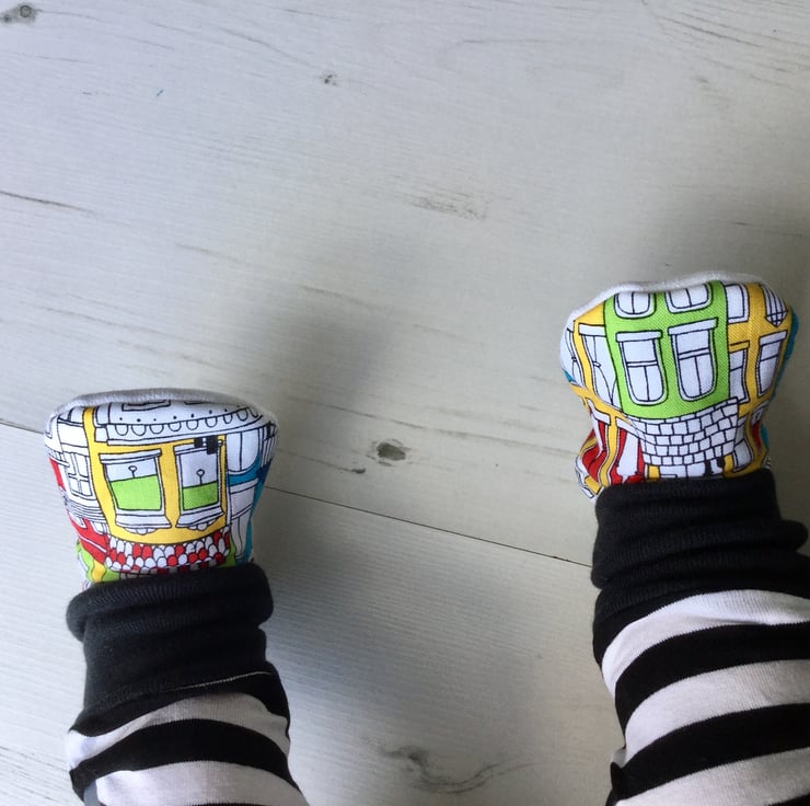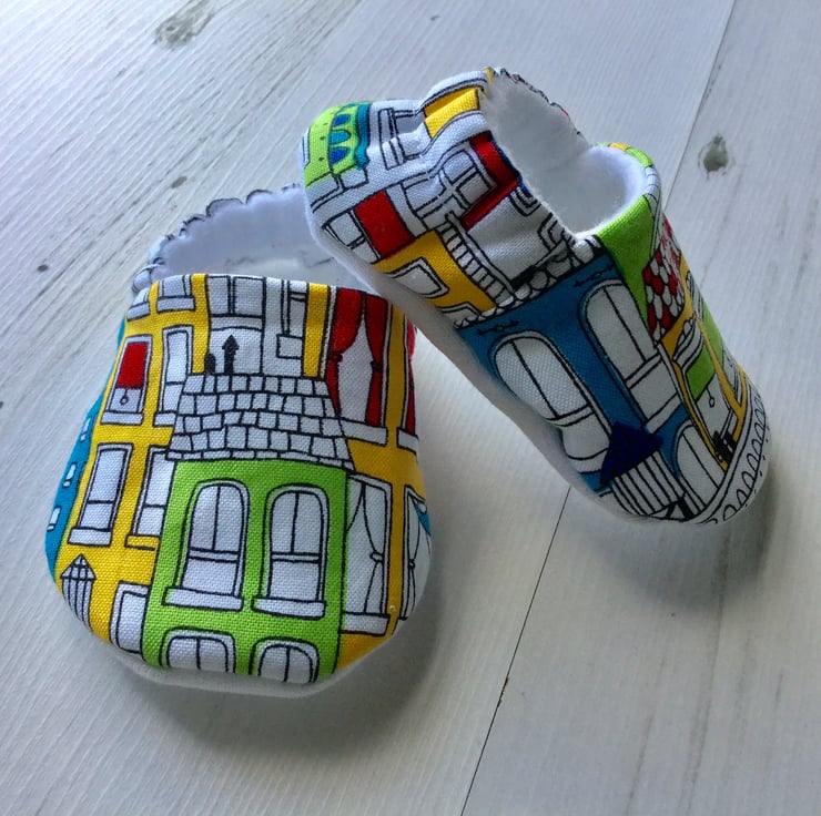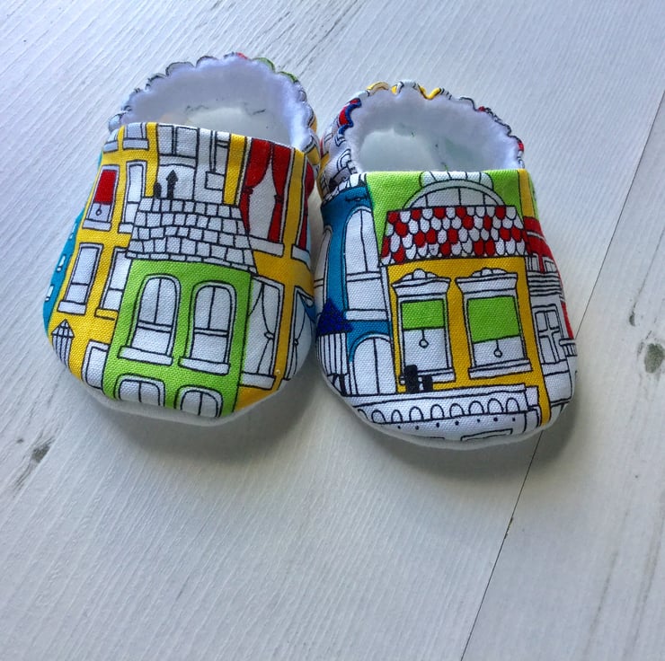 I love kids clothes and love anything a little bit different to that which you see on the high-street - I love items which add a sense of humour to an outfit or switch an outfit from bland to fab with an addition of just one or two statement pieces - just like these fab little cityscape fabric shoes - Hope you love them too. x