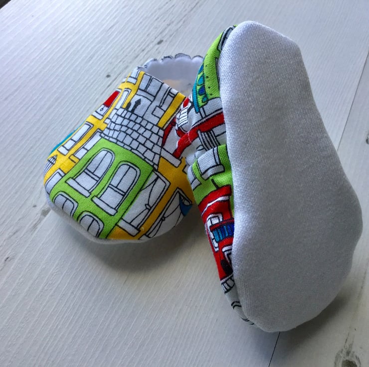 BELLAOSKI Baby Pram Shoes in this multi-coloured CITYSCAPE print on a white fabric, in size 3-6 Months Only.