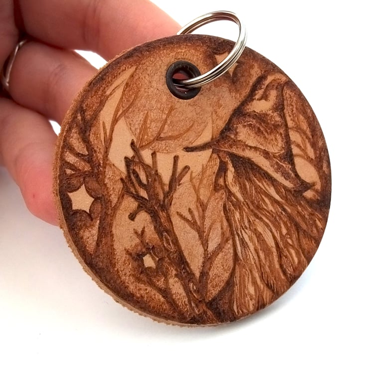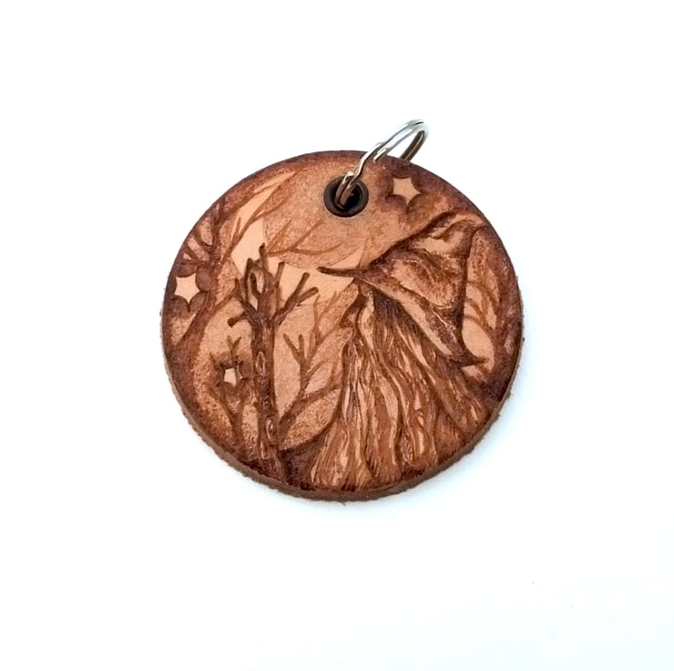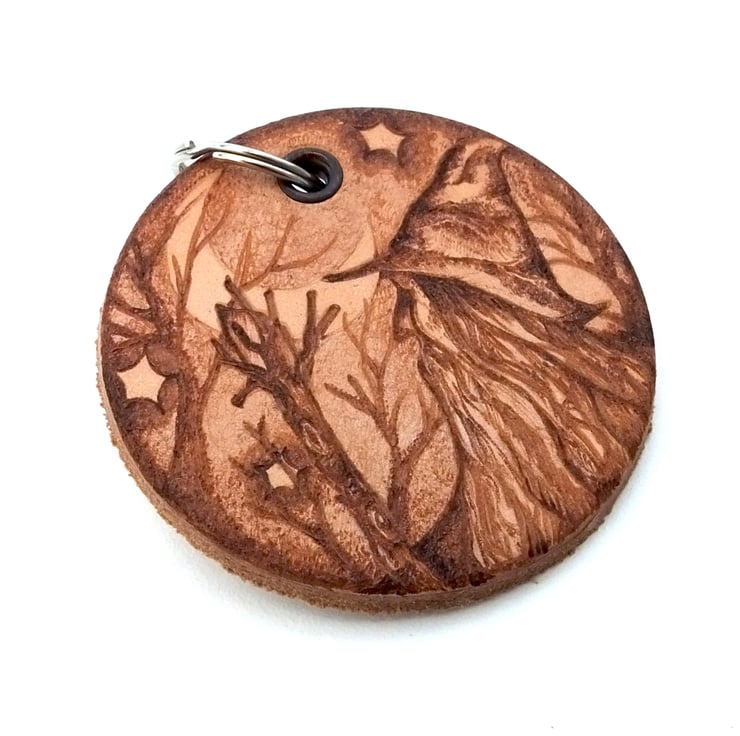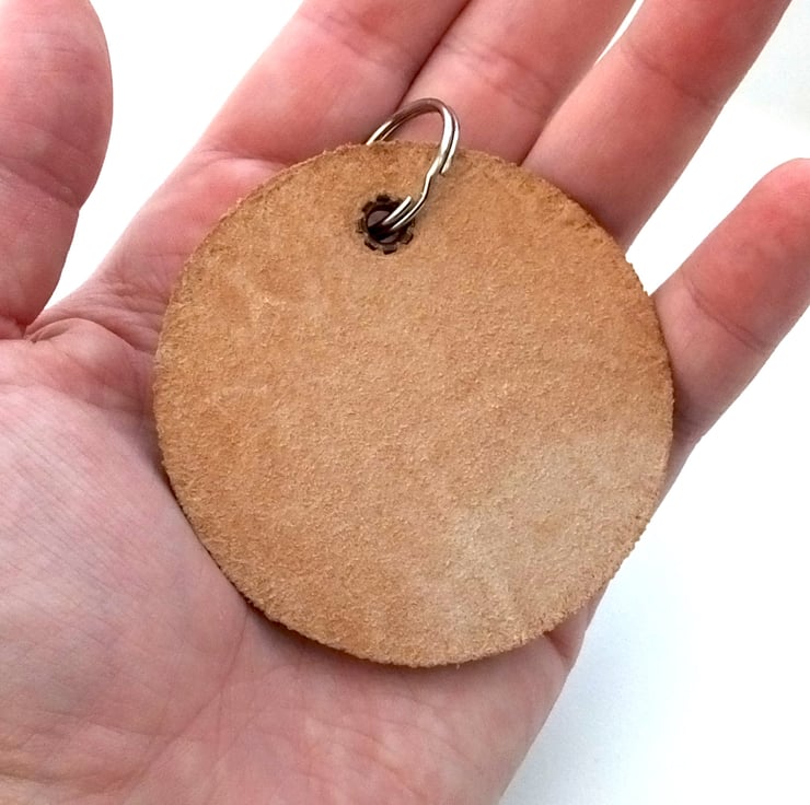 The disc of leather is 6cm in diameter. It is hand burned using the art of pyrography on the polished side. The design is a wizard with hat and staff. The other side has been left natural and tactile. The surface has been oiled to protect the design, but leather does age beautifully with time and use as it collects oils. Please keep out of water and keep out of direct sun.