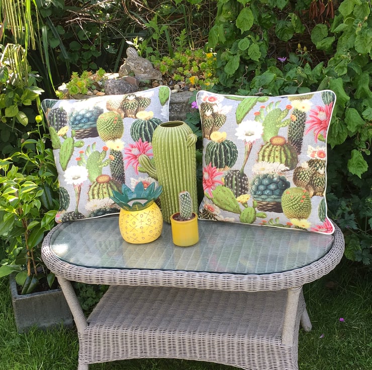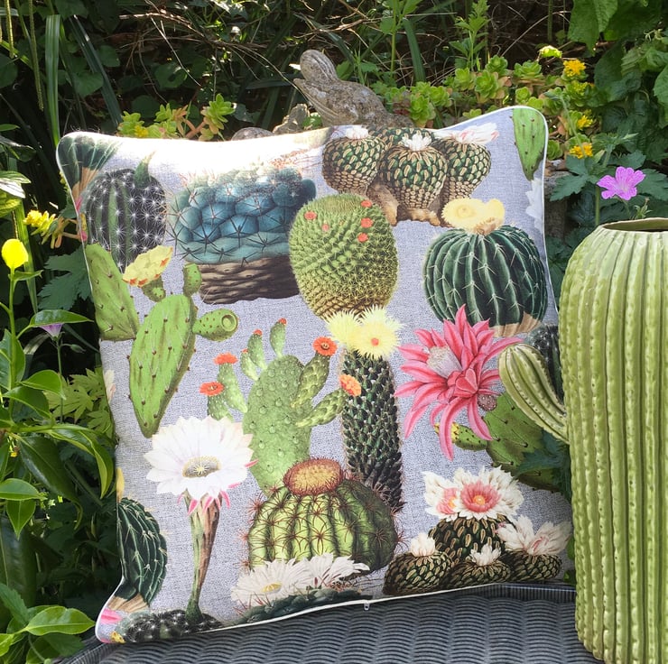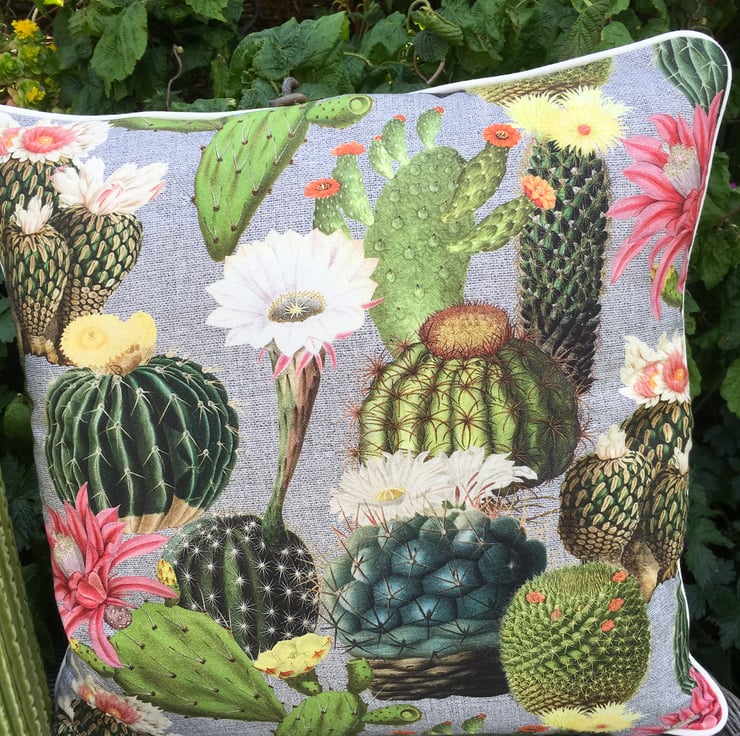Cactus cushion in a linen mix fabric. An assortment of cacti and succulents adorn the front of the cushion, enhanced by a cream coloured piped edging. On the back of the cushion is a co-ordinating lime green ticking fabric, central zip and makers label.