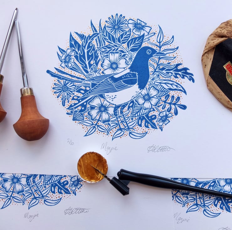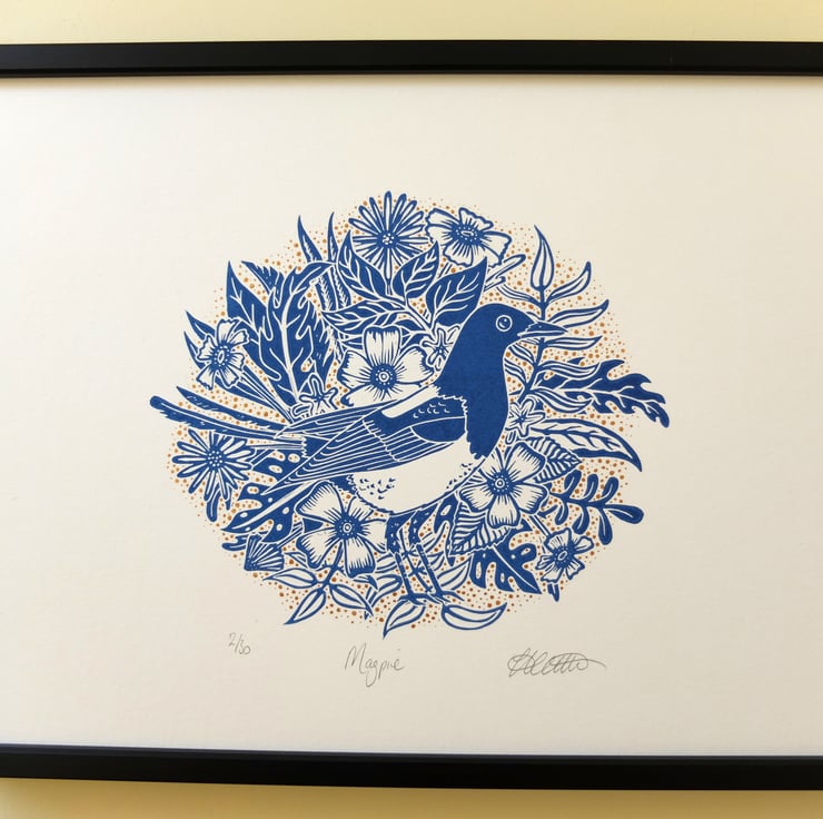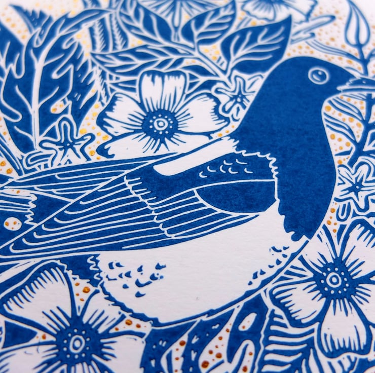 This listing is for a limited edition original lino print of 'Magpie' in an indigo blue colour. I have then used a calligraphy nib to add little dots of shimmering gold ink dots incorporated into the design. These capture the light beautifully!