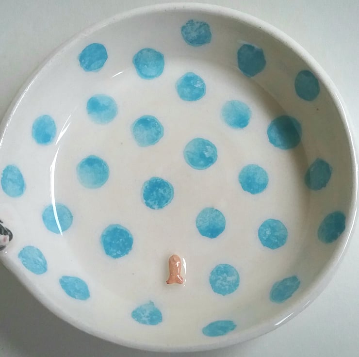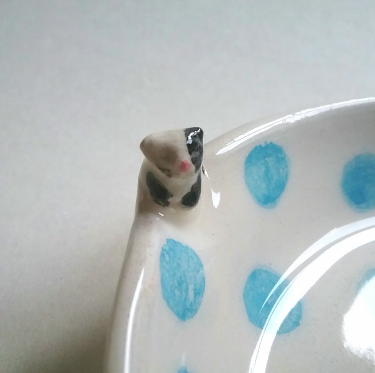 I thought that for a cat bowl that is always on display it would be great to make it fun to look at. The tiny cat is keeping watch over the tiny fish.