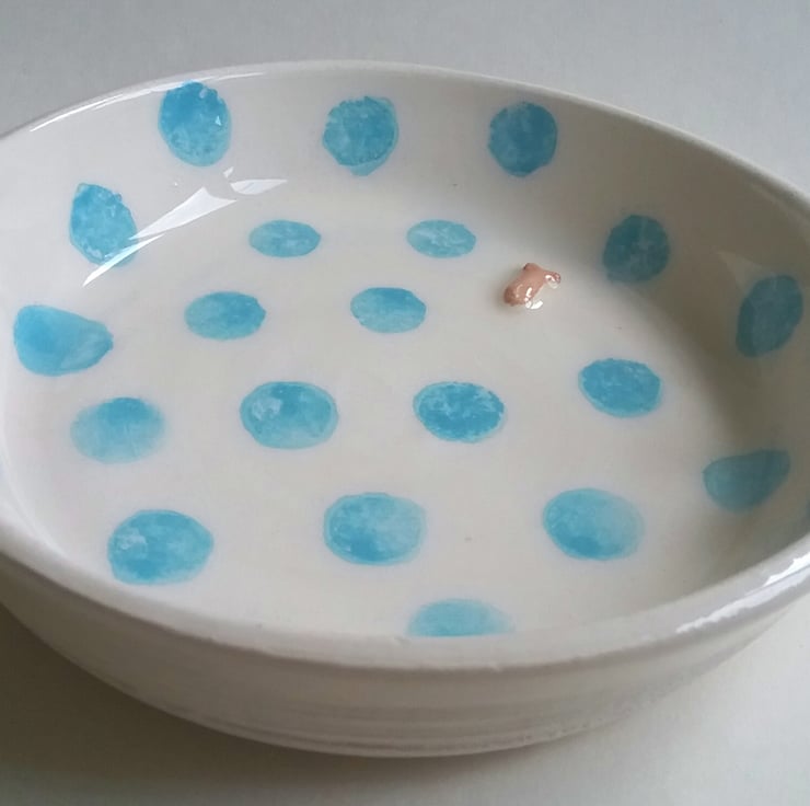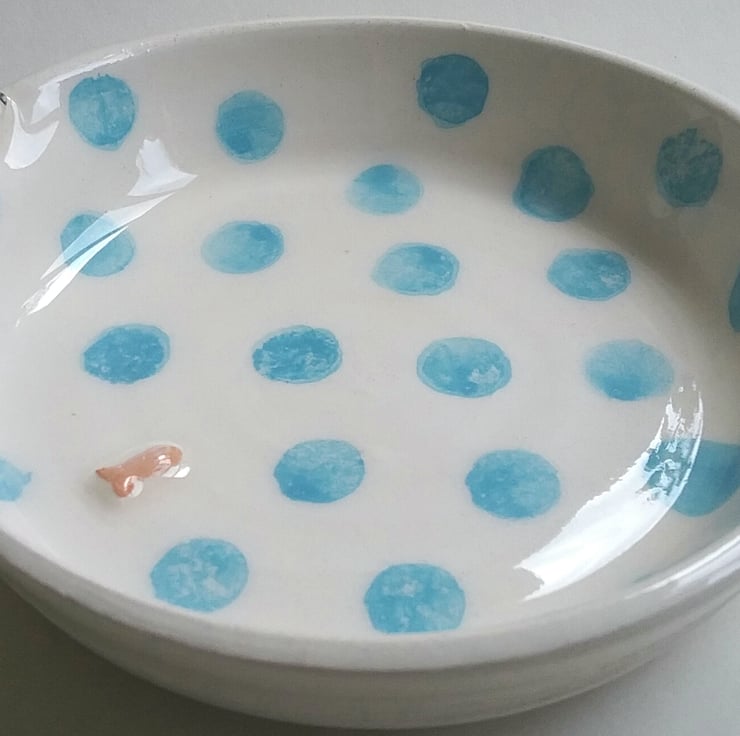 The dish was hand painted and glazed using clear lead-free clear glaze before firing again to earthenware.