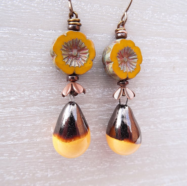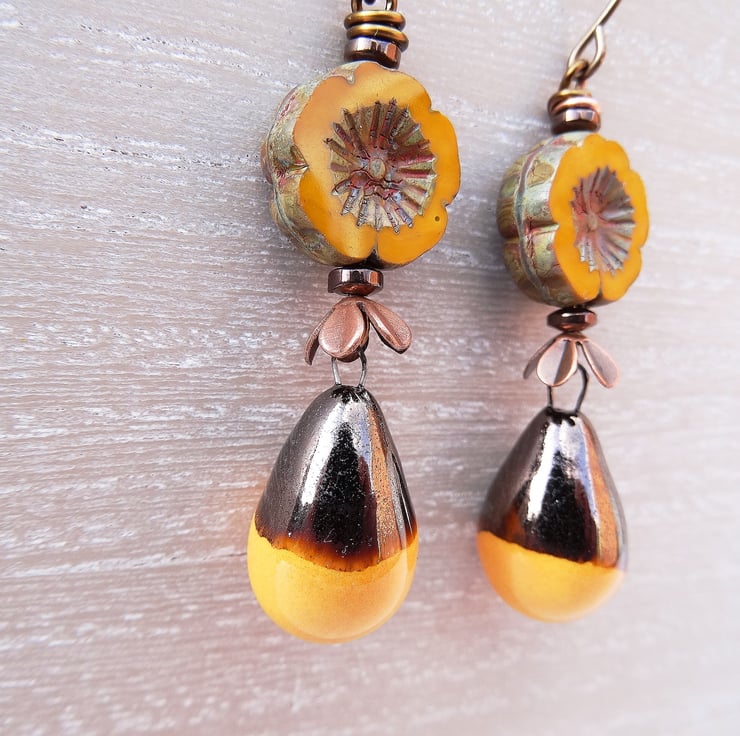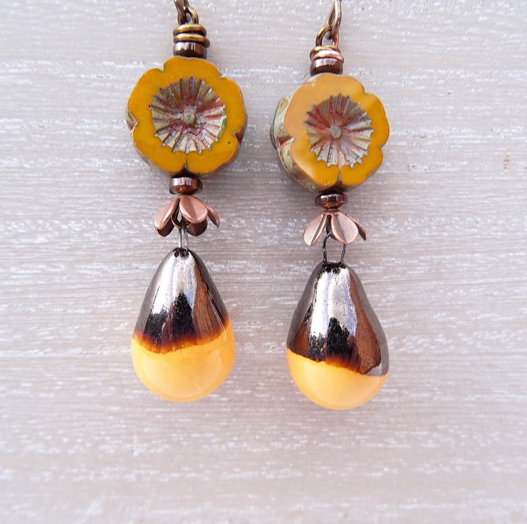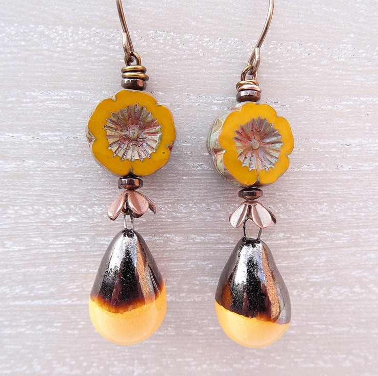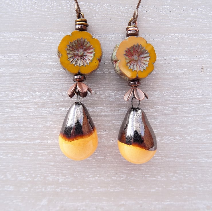 These are beautiful earrings, perfect for summer with a boho look. I have made them using handmade ceramic droplets with a mustard and bronze glaze. I have topped them with antique bronze coloured petal bead caps. To these I have wired 14mm mustard, czech glass, pansy flower beads. The earrings measure 2.5 inches (6.5cm) from top of vintaj brass, nickel free, round loop earwires.