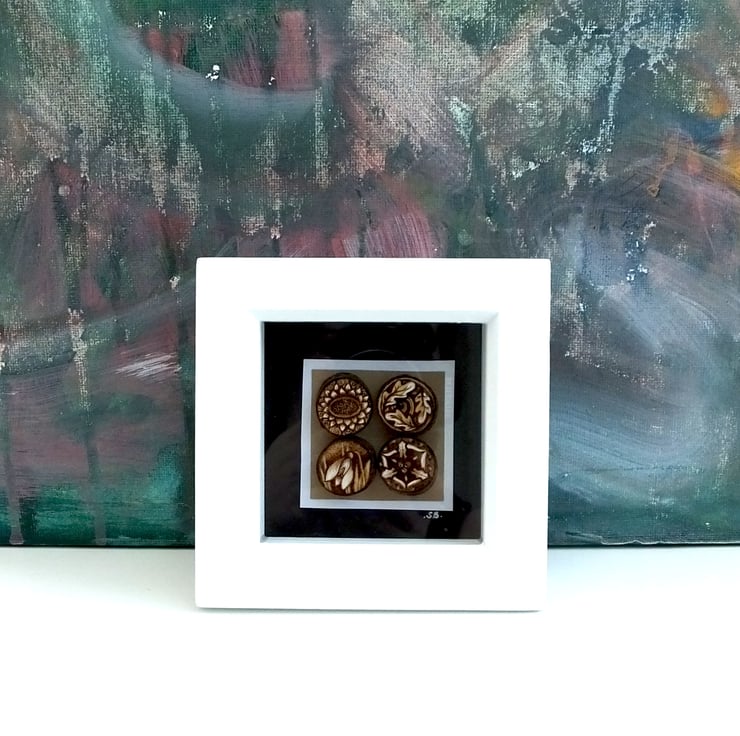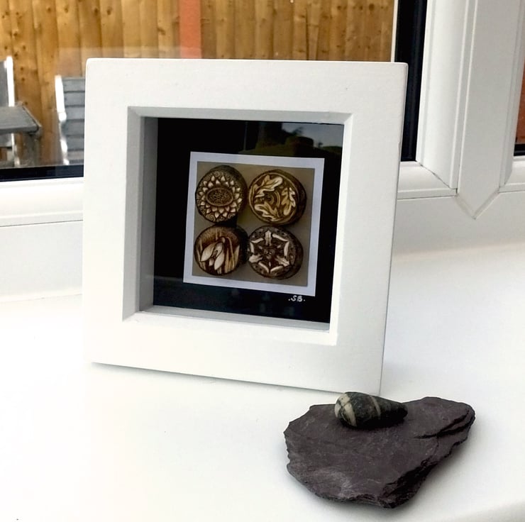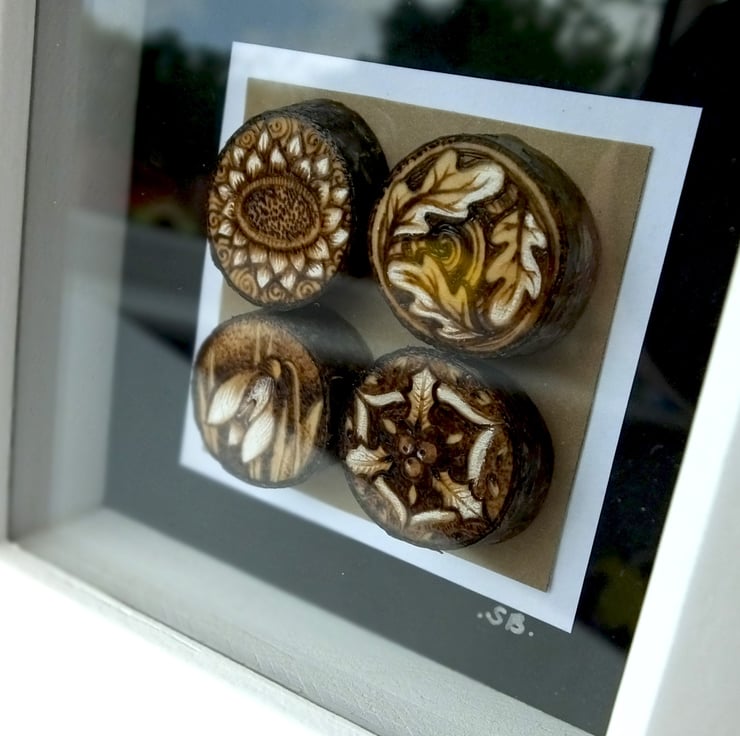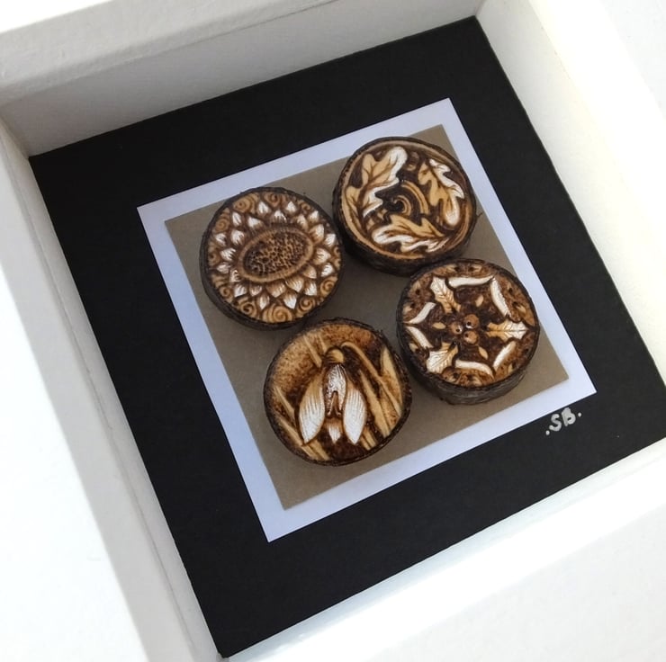 Here is a gorgeous mini box frame with a group of 4 miniature tree slices, each carrying a tiny design. This one is based on the seasons, with one for Spring (snowdrop), Summer (sunflower), Autumn (falling oak leaves) and Winter (Holly).