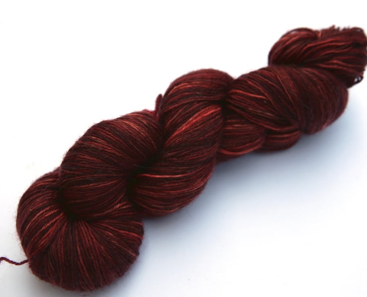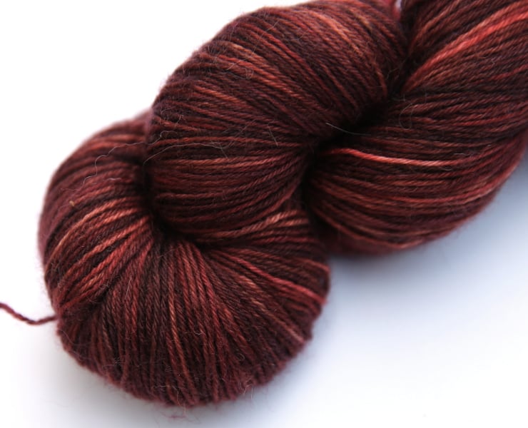 Shades of warm red browns - copper, chestnut, spicy browns through to darker chocolate browns, with touches of red-orange . This Bluefaced Leicester superwash yarn is soft with a very slight lustre. Photos taken and edited in bright natural light. This skein contains a join.