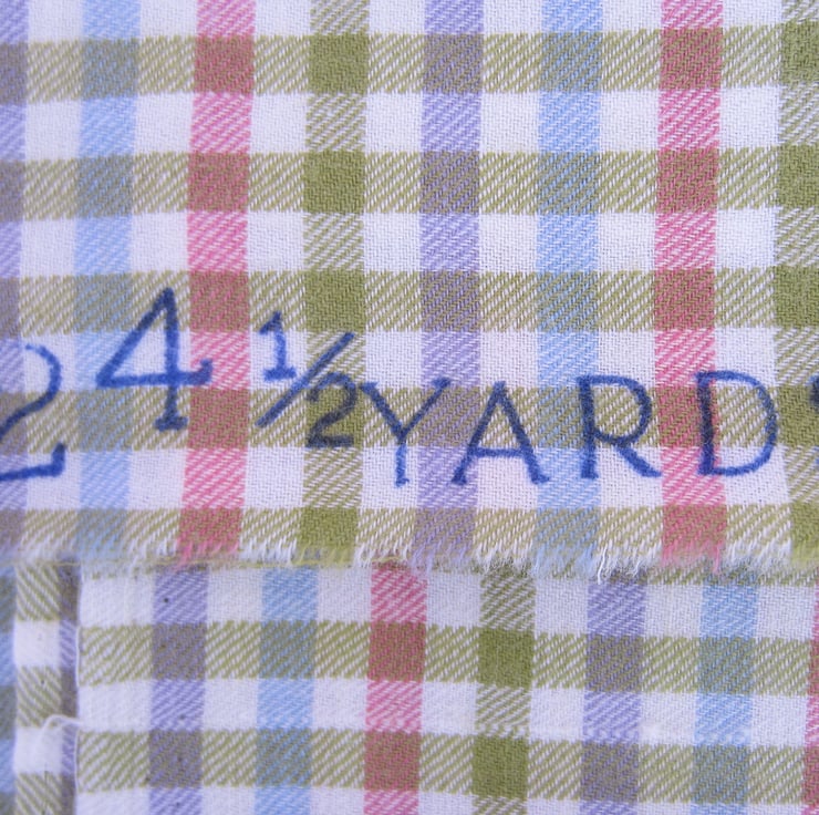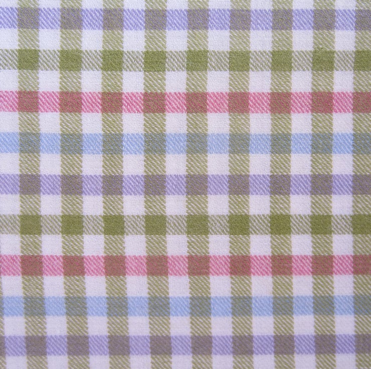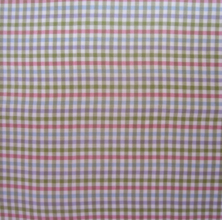 5 mm (nearly 1/4 inch) check in pink, blue, mauve, sage green and white.