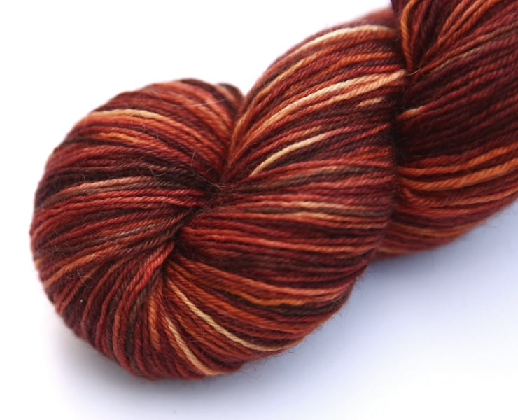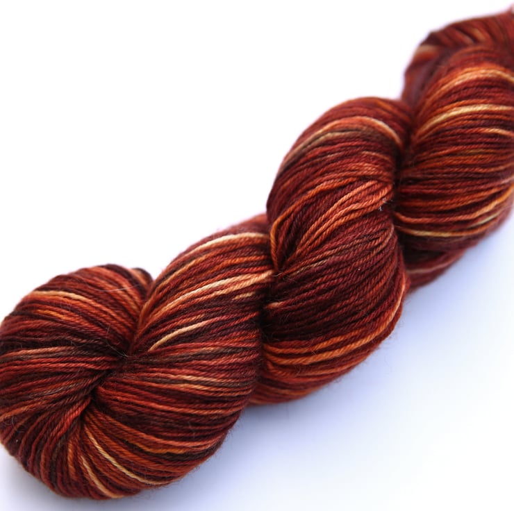 Woody red-browns - copper, terracotta, chestnut, ochre, walnut, hickory.... This Bluefaced Leicester superwash yarn is soft with a very slight lustre. Photos taken and edited in bright natural light.