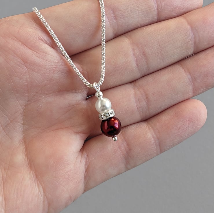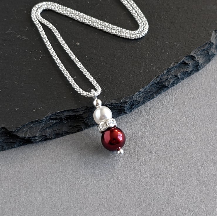 The claret and white pearl pendant has been created with glass pearls and bands of sparkling crystals. A lone white pearl sits in a crystallised belt, above a single burgundy pearl. These pearl and crystal necklaces make the ideal bridal party gift for bridesmaids in a dark red themed wedding.