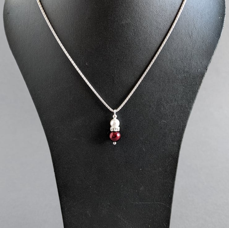 The claret and white pearl pendant has been created with glass pearls and bands of sparkling crystals. A lone white pearl sits in a crystallised belt, above a single burgundy pearl. These pearl and crystal necklaces make the ideal bridal party gift for bridesmaids in a dark red themed wedding.