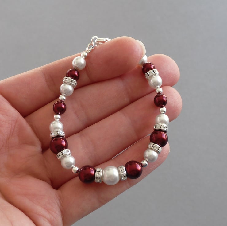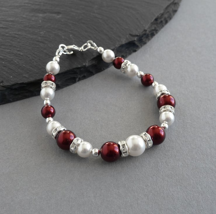 I have used coloured glass pearls and crystal embedded bands to create this burgundy and white pearl bracelet. The lustre of the pearls and the sparkle of the crystals makes these single strand bracelets the ideal bridal party gift for bridesmaids in a dark red themed wedding.