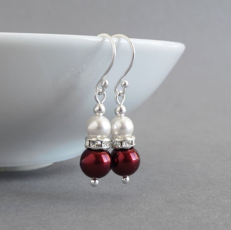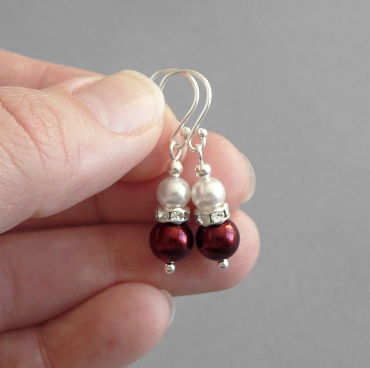 These burgundy pearl drop earrings have been created using coloured glass pearls and crystal bands. A single white pearl sits in a belt of sparkling crystals, above a lone claret pearl. These pearl and crystal earrings would make the perfect addition to a dark red themed wedding.
