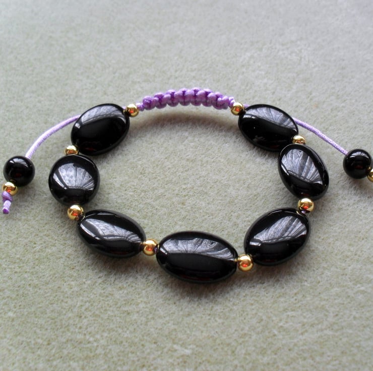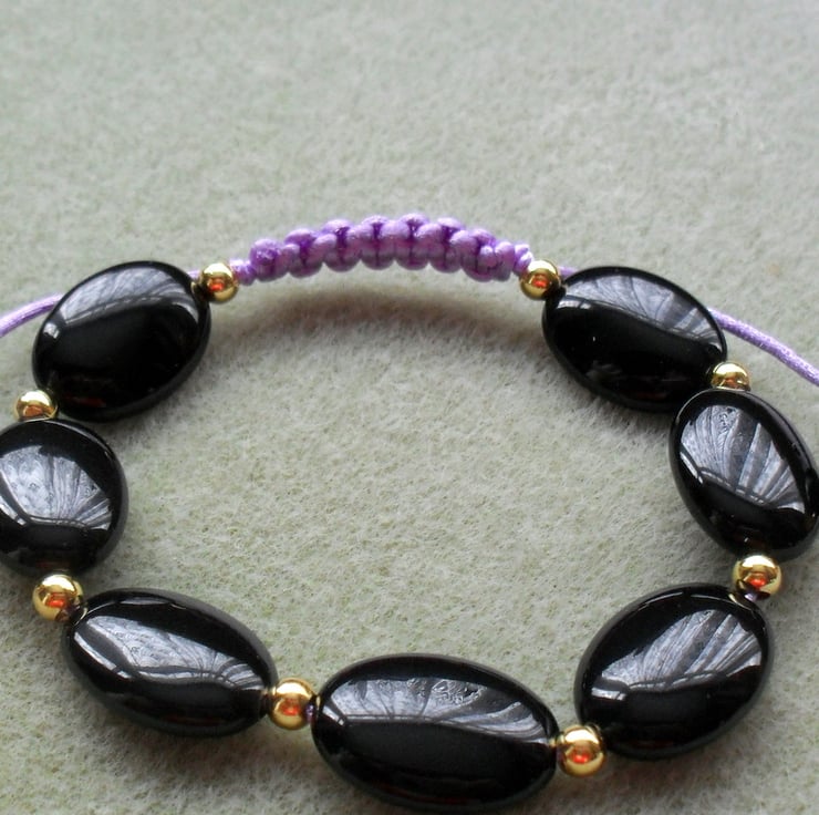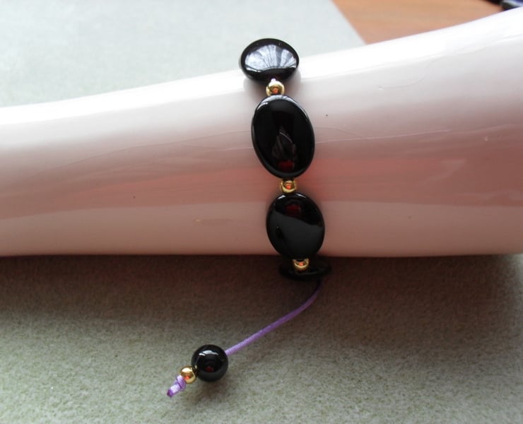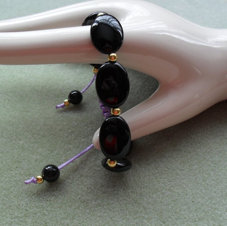 Black agate oval shaped beads and gold plated brass beads are knotted onto a lilac coloured satin cord