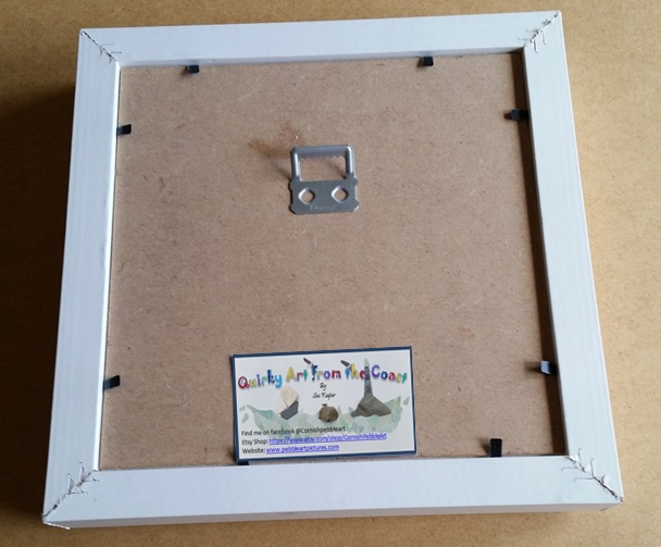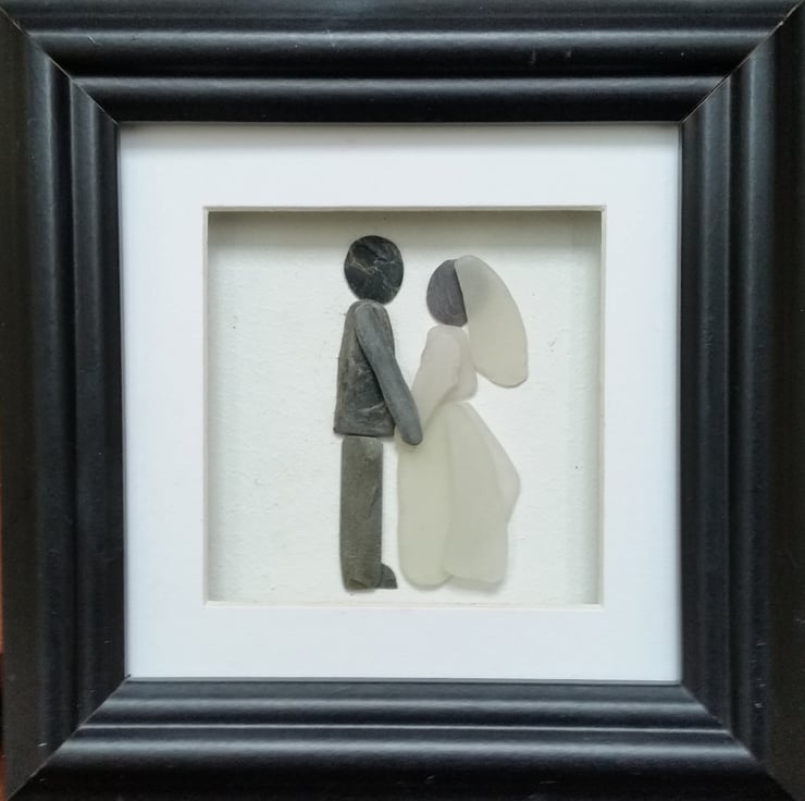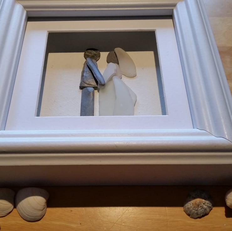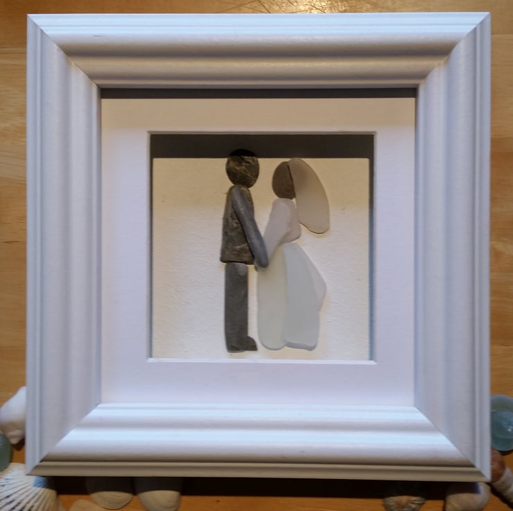 This sea glass and stone little bride and groom is set inside a 20cmx 20cm glazed box frame that can stand alone or hang on the wall.