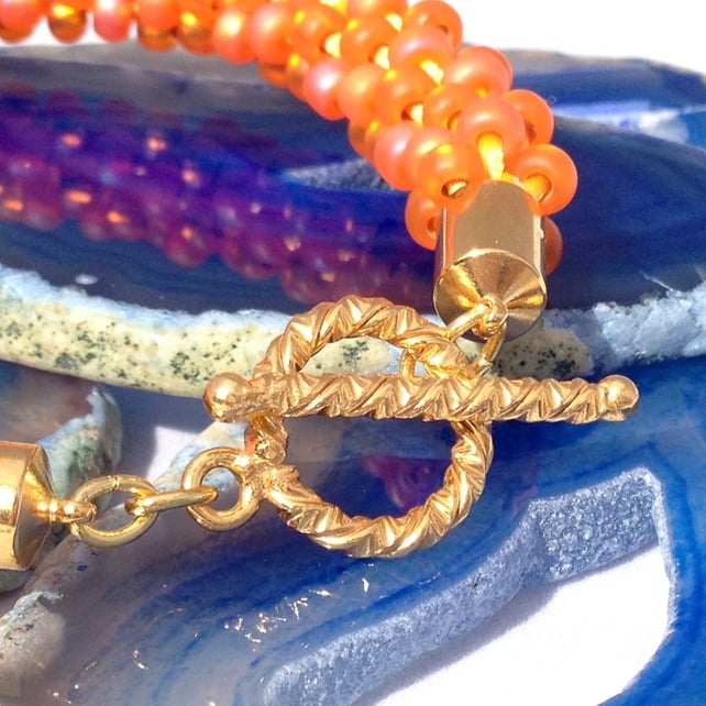 The seed beads used are matte orange AB and matte silver lined orange, so although this is a bright bracelet, it doesn't have any sparkle or twinkle to it, but more of a glow as the light hits the beads.