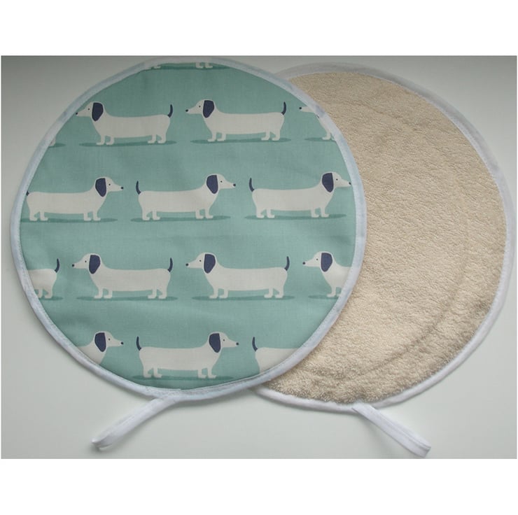 This mat has three layers - Facing cotton fabric, a layer of padding and a layer of towelling - Making it also suitable for mopping up and pot-grabbing!