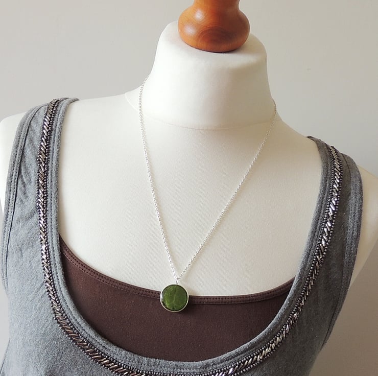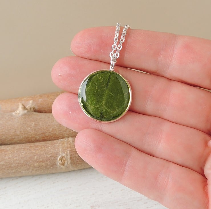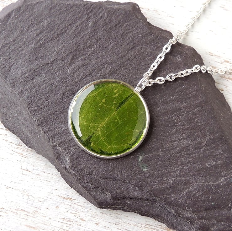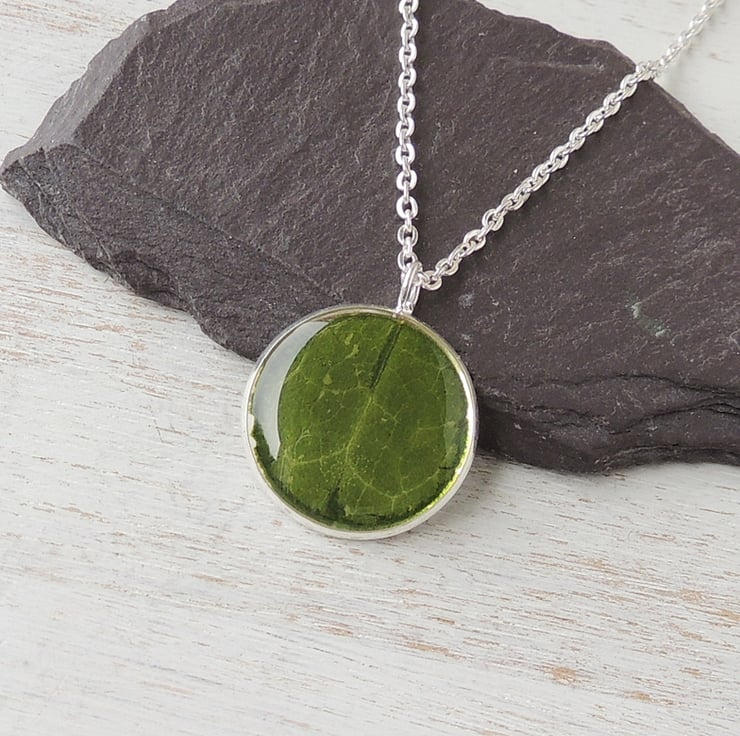 I made it with a real leaf that I have picked and pressed to use in my resin jewellery. The leaf was cut to size, set into a silver plated pendant bezel then sealed with a coat of clear resin.