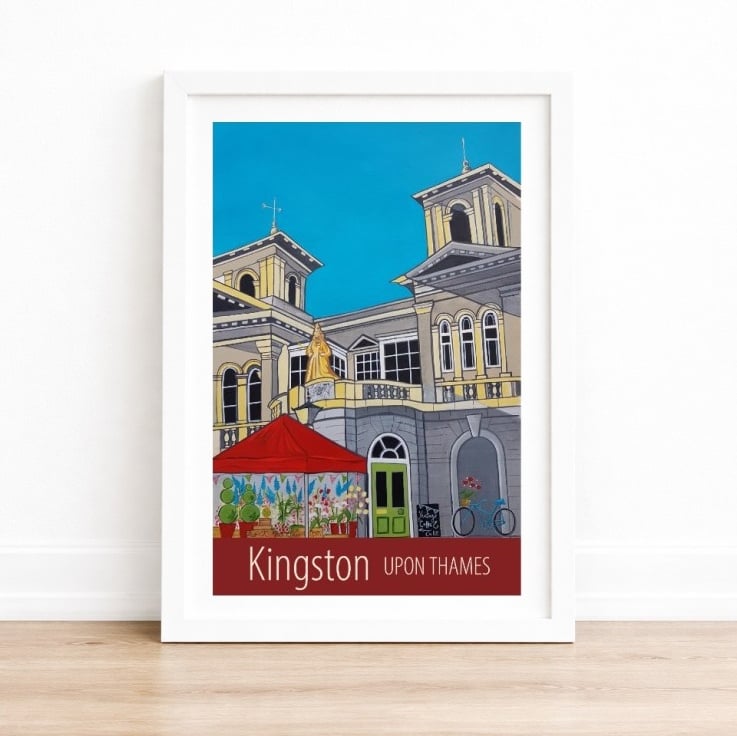 A contemporary travel poster style print of the Market Square and Hall in Kingston-upon-Thames, London, from my own original acrylic painting. A perfect gift for those who love Kingston!