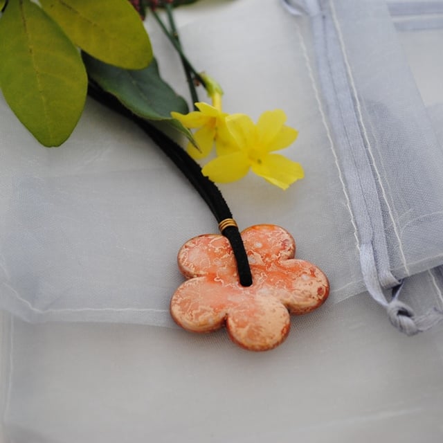 Lovely orange ceramic daisy necklace. The orange daisy has gold tones and is approximately 3 cm in length. The daisy is hung on a faux black suede / leather necklace which is finished with copper cord ends and a matching copper lobster clasp.