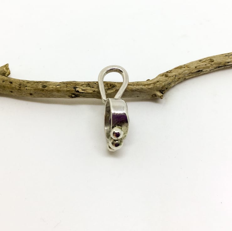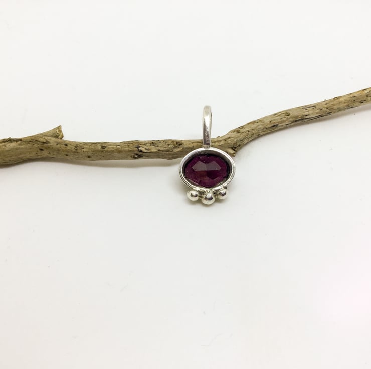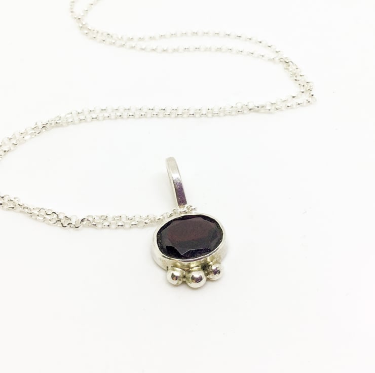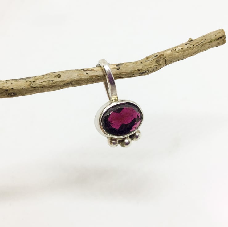 A handmade garnet pendant in sterling silver, with silver decorations.