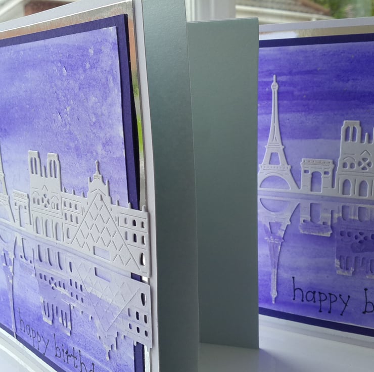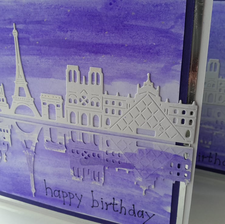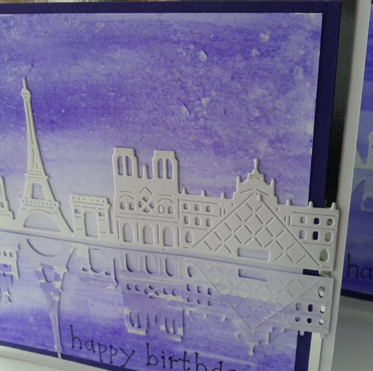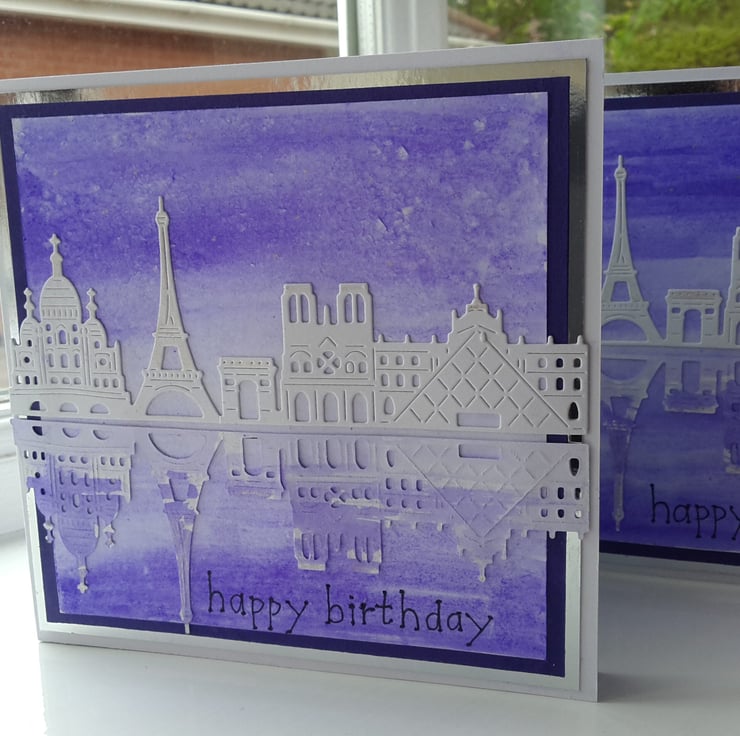 A completely handmade and uniquely designed card. Consisting of the Paris skyline die cut from white card along with it's mirror image. Mounted onto white card which has been hand coloured using indigo ink. Mounted onto purple card then silver mirri card and then onto quality pristine white card