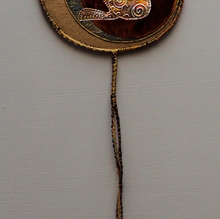 Hand embossed metal Hare stitched wall hanging. Hand painted fabric (suede and button moon) on silk and velvet. 15cm (6 inch) diameter plus yarn loop and danglers with hand rolled, painted beads.Edged with yarn and gold colour rayon machine stitching (Overall length 51 cm)