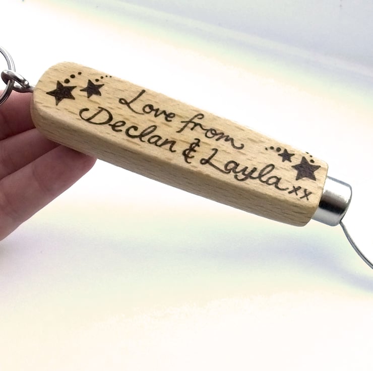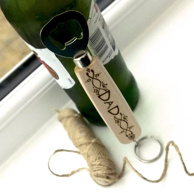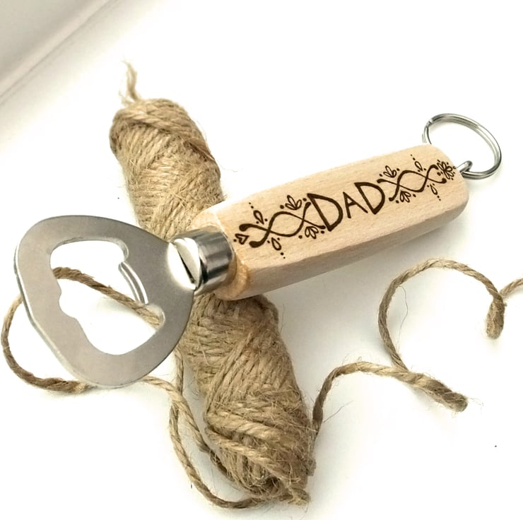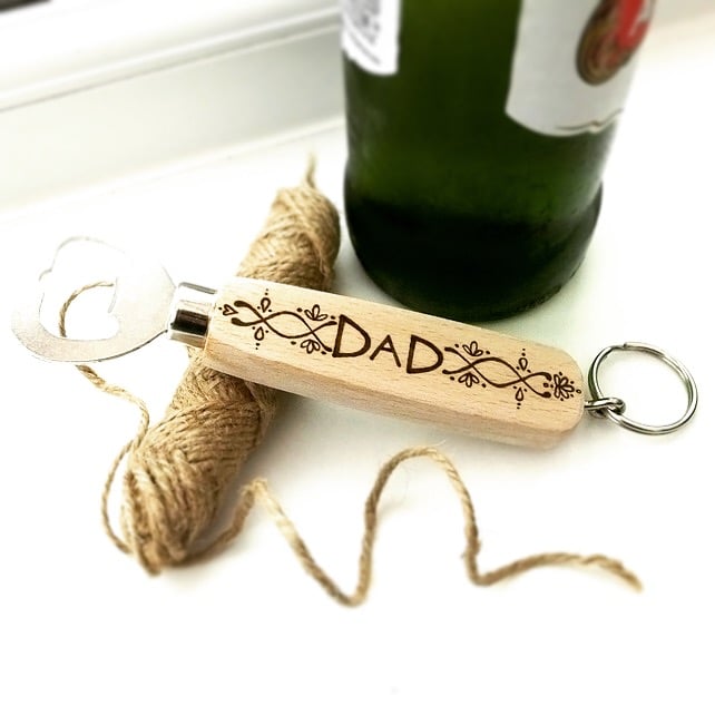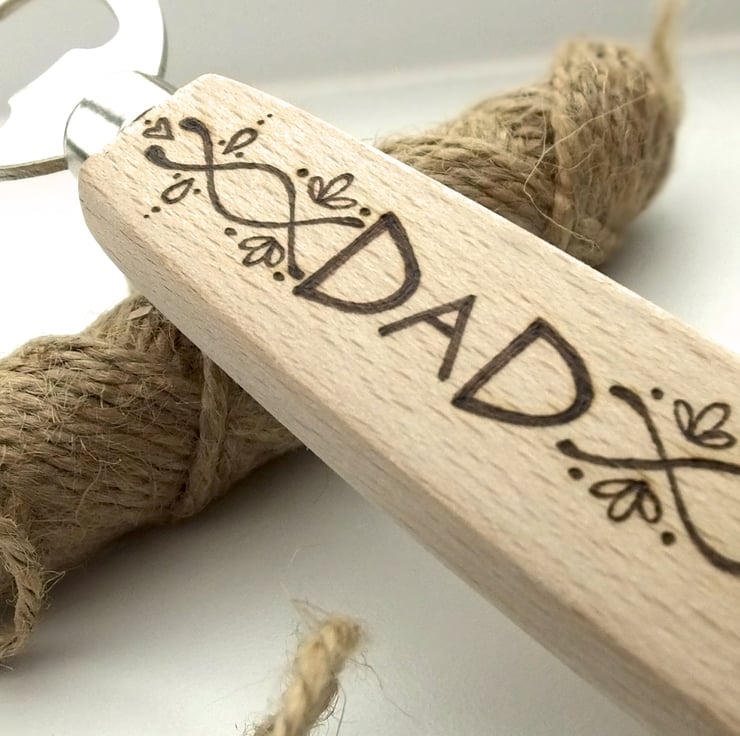 A chunky pattern design wooden bottle opener for Dad. Created using pyrography, with space on the reverse (see last pic for example) to write 'from...' or a date or perhaps a short message. These are made to order so each looks a little different and can be made with alternate text on the front, Grandad, Mum, Mr and Mrs... etc! Just get in touch.