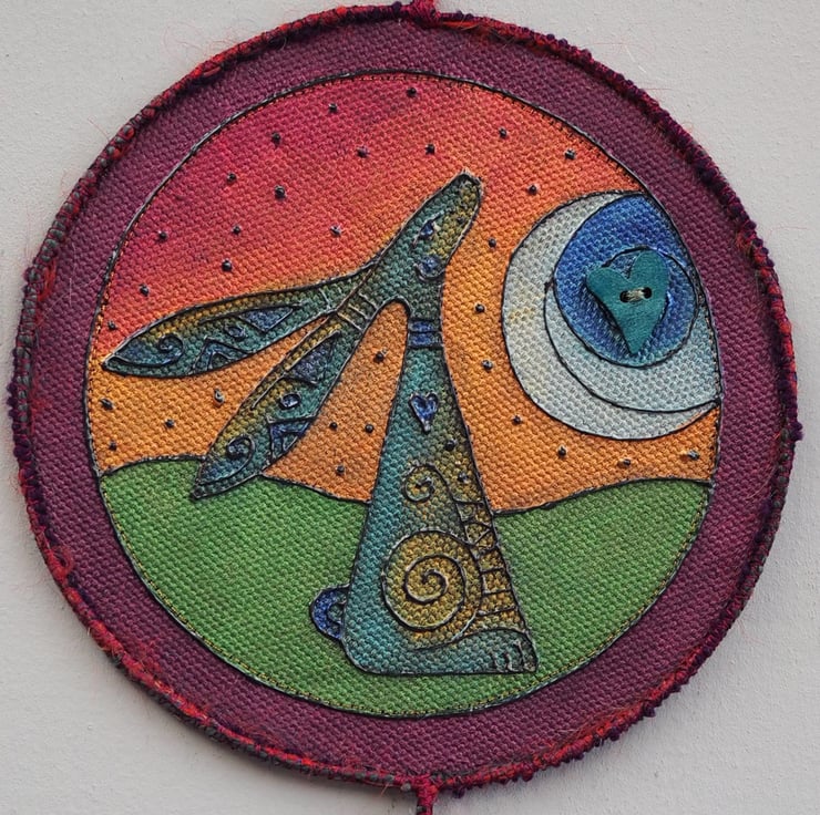 Original Hare lino cut,printed then painted and outlined on a hand painted fabric background.15cm (6 inch) diameter plus yarn loop and danglers with hand rolled, painted paper beads. Edged with yarn and plum coloured rayon thread machine stitching (Overall length 50cm) Please see the 2nd pic for full length.