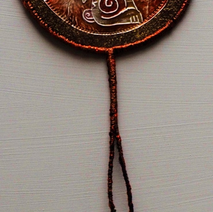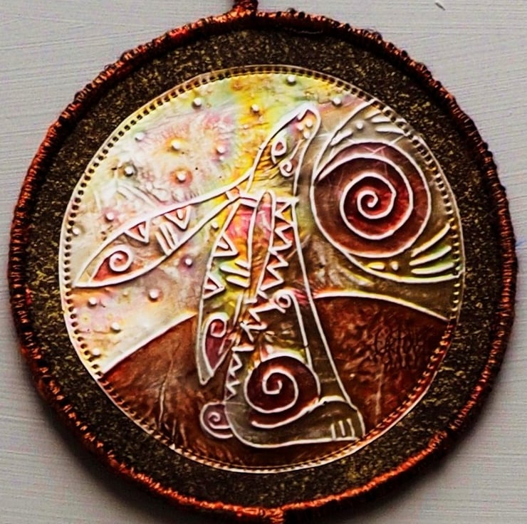 Moon Gazer Hare Mandala - Hand painted fabric and hand embossed metal Hare stitched wall hanging. 12.5cm (5 inch) diameter plus yarn loop and danglers with hand rolled, painted paper beads.Edged with yarn and copper metallic machine stitching (Overall length 45cm)