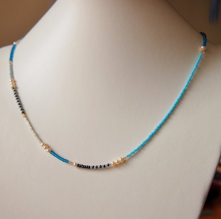 Gorgeous wrap style bracelet consisting of Miyuki Glass Delica and Rocaille beads in shades of turquoise, blue, silver and charcoal grey interspersed with freshwater pearls, Iolite and tiny Swarovski crystals like grains of sand.