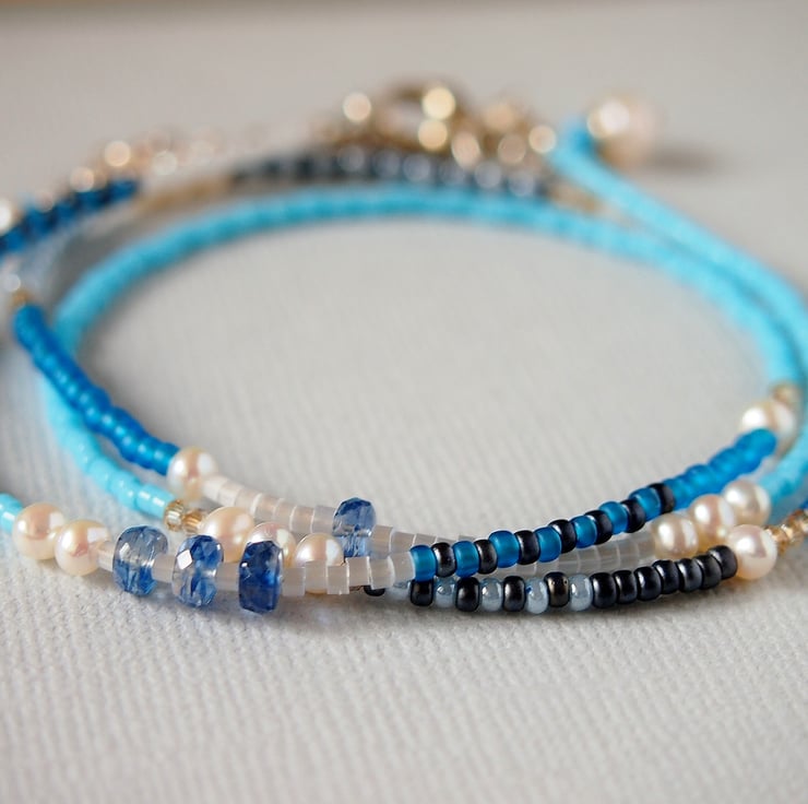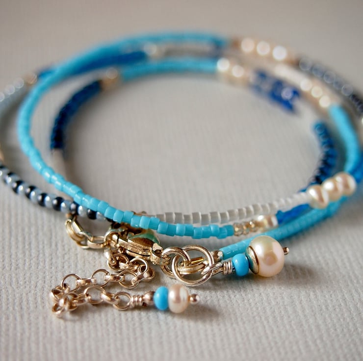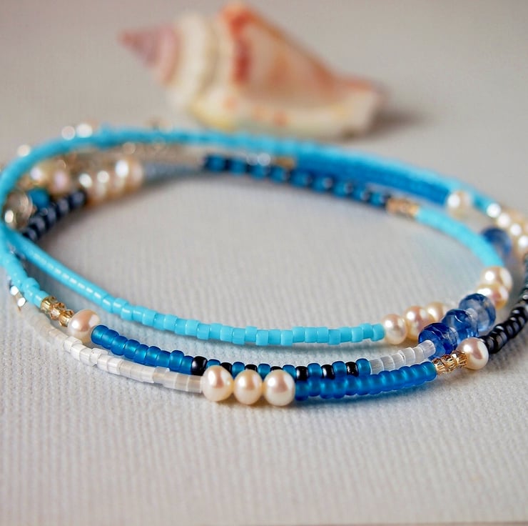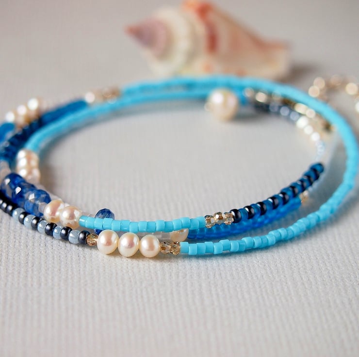 Gorgeous wrap style bracelet consisting of Miyuki Glass Delica and Rocaille beads in shades of turquoise, blue, silver and charcoal grey interspersed with freshwater pearls, Iolite and tiny Swarovski crystals like grains of sand.