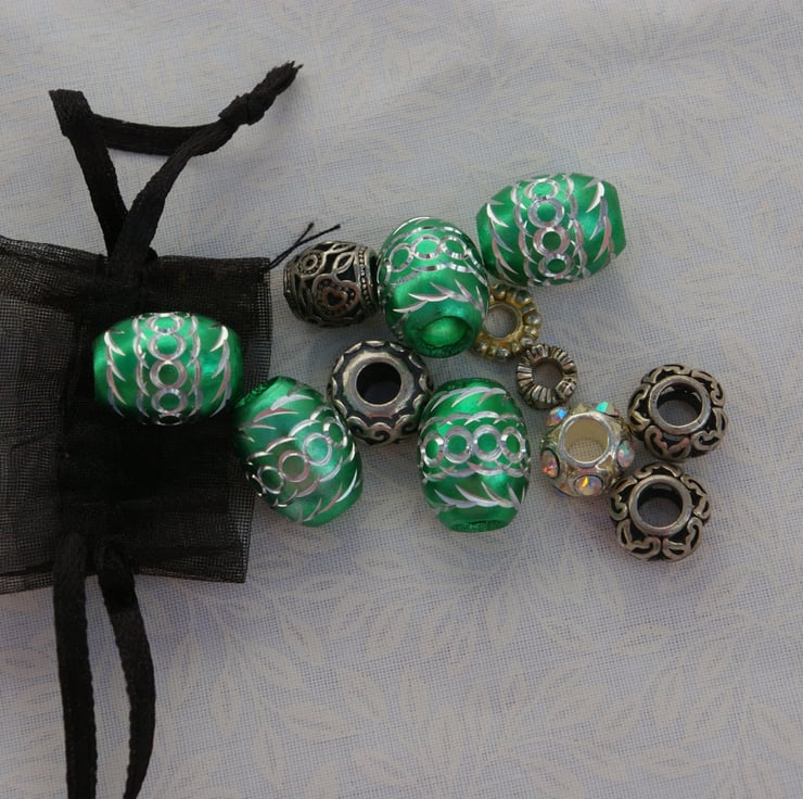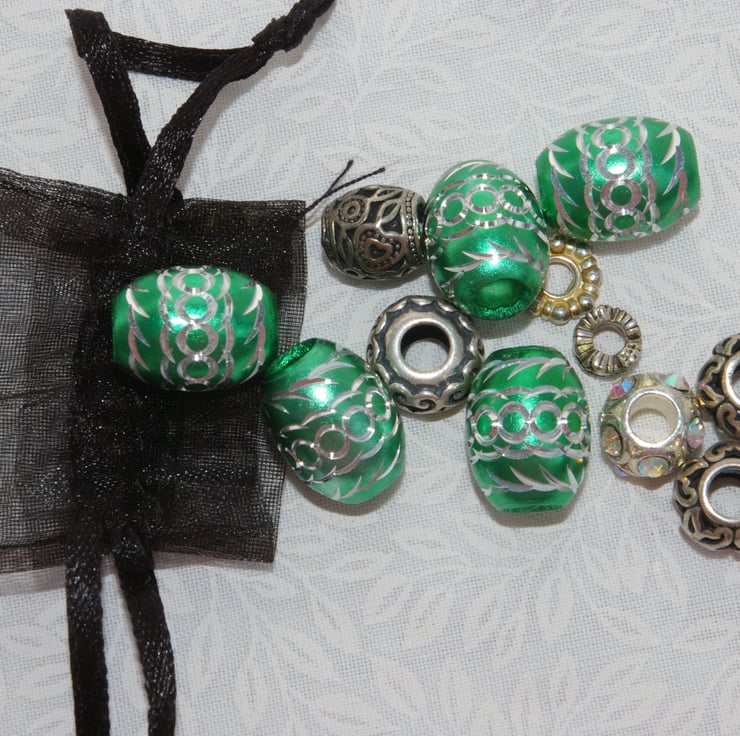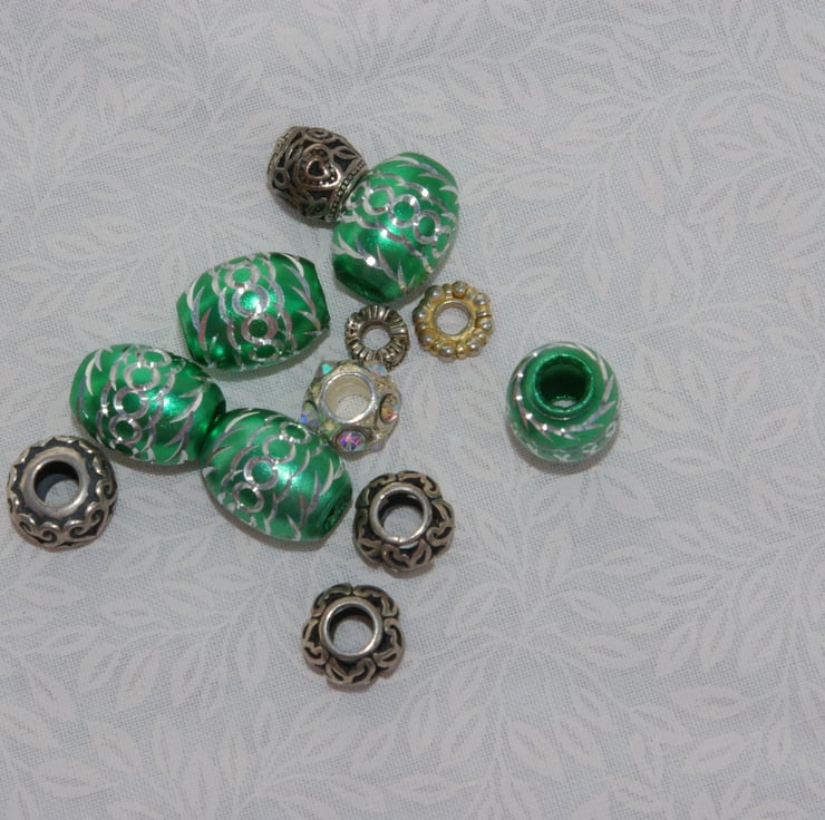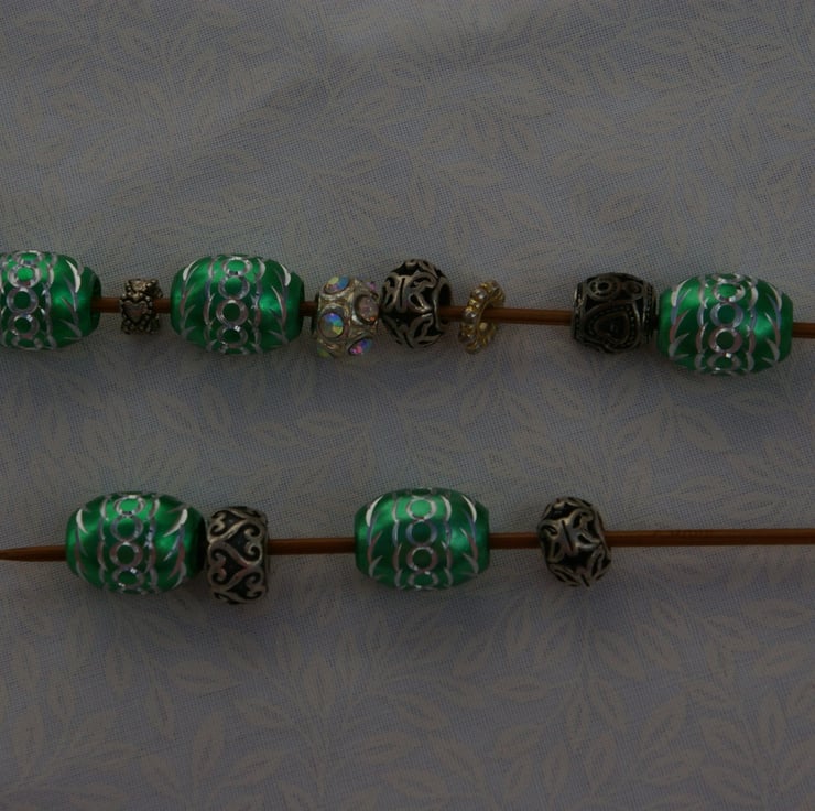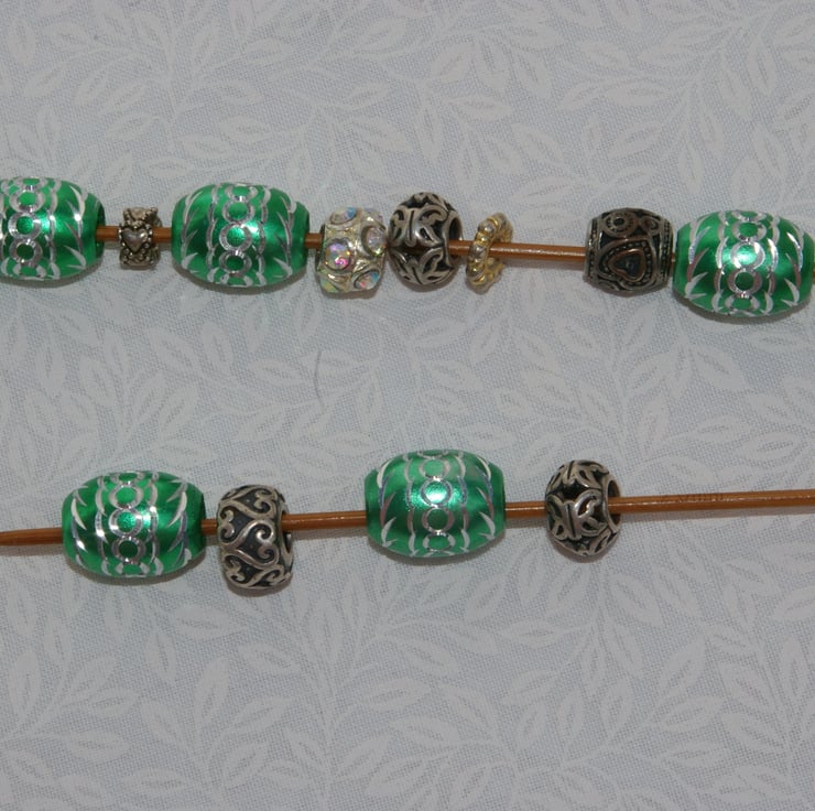 There are five green beads with a cut out design showing through the silver colour (aluminium ) beneath.