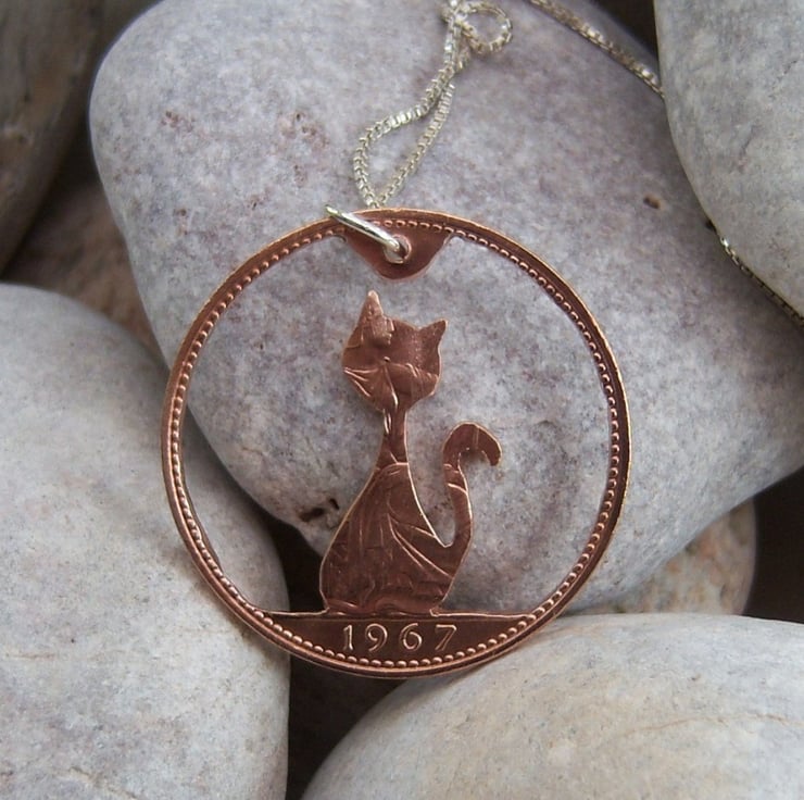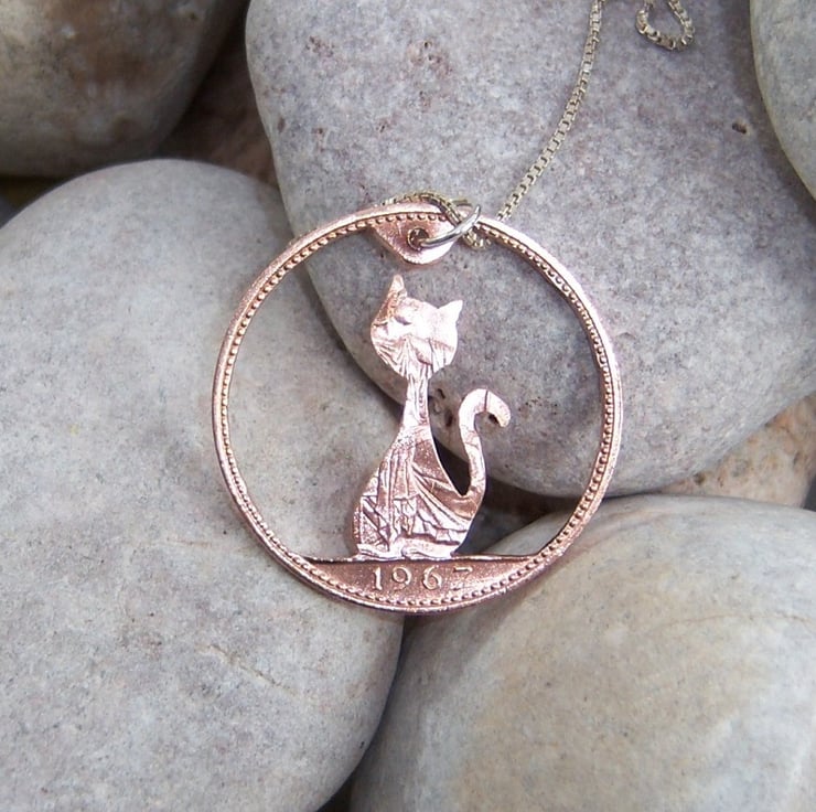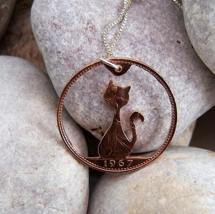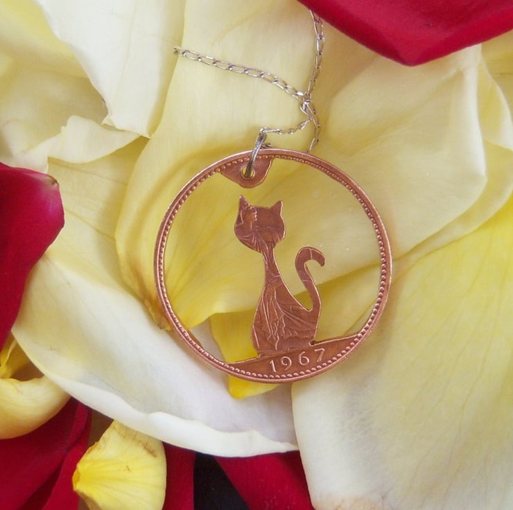 A cat silhouette cut from a 1967 bronze penny coin, (this is Version 2). 3cms across. Supplied with a sterling silver chain, 16 or 18 inch, please specify when ordering.