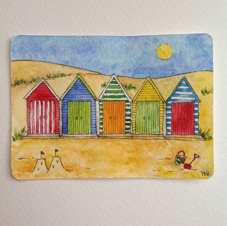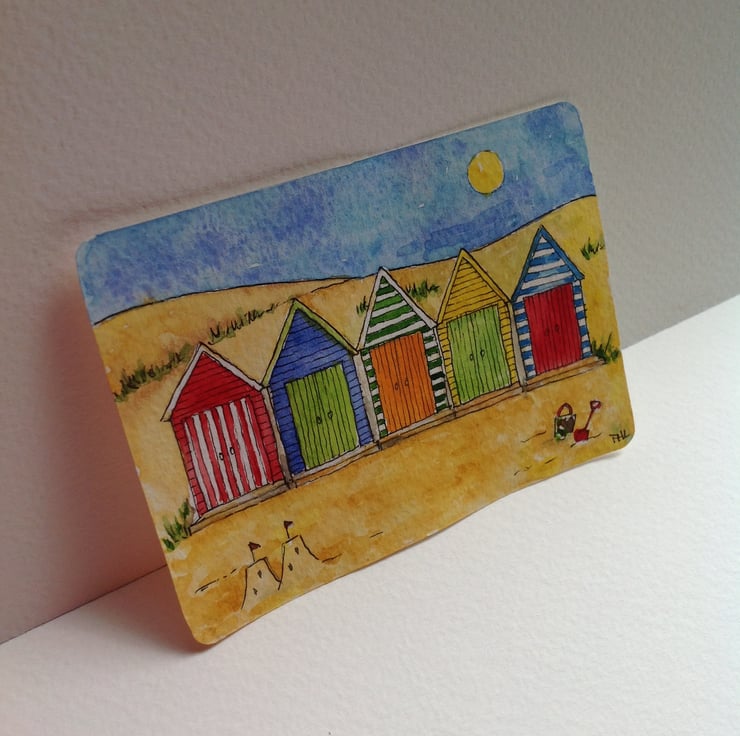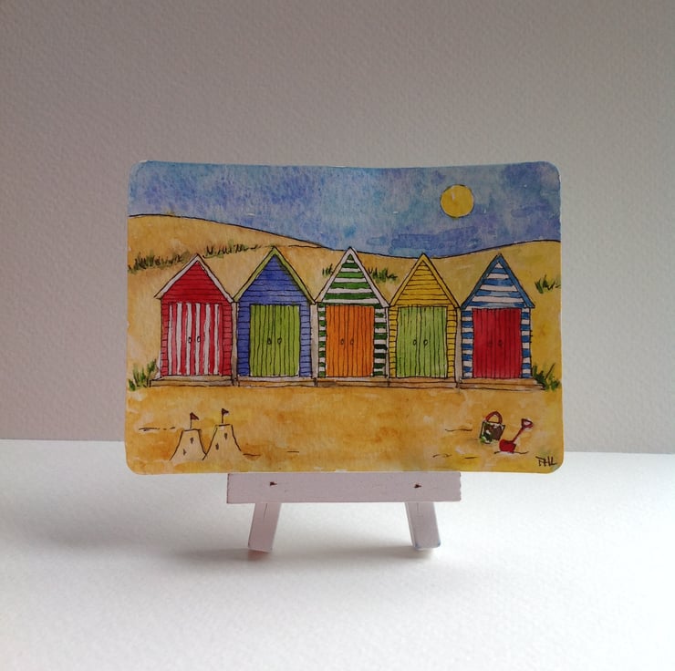 This ACEO is an original, hand painted watercolour of beach huts and sand dunes - a real celebration of a British summer holiday! It measures 2.5 x 3.5 inches (63 x 89mm).