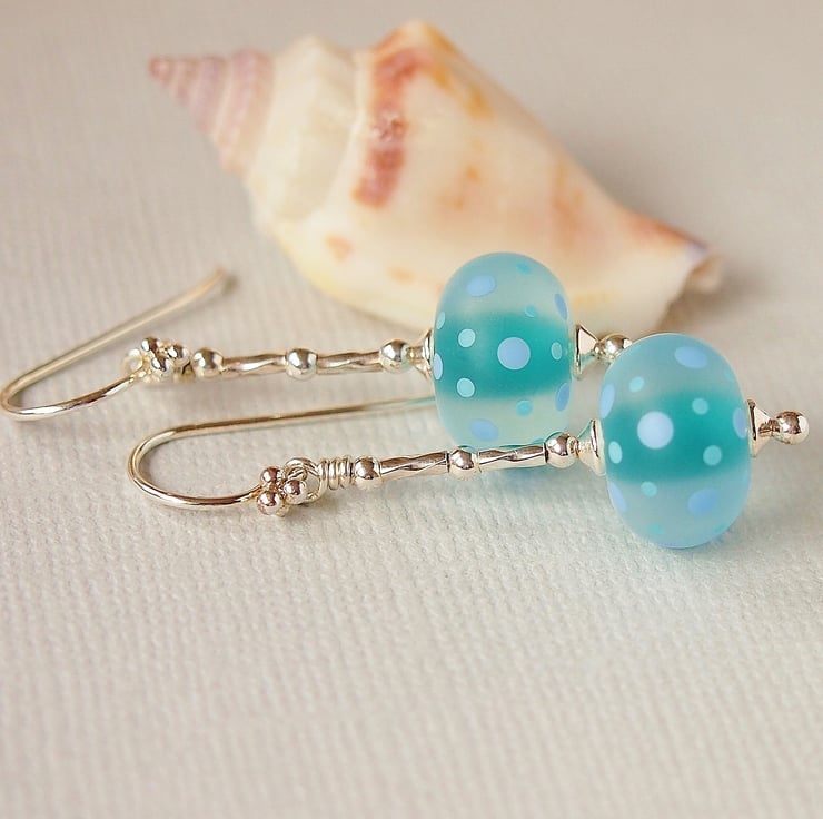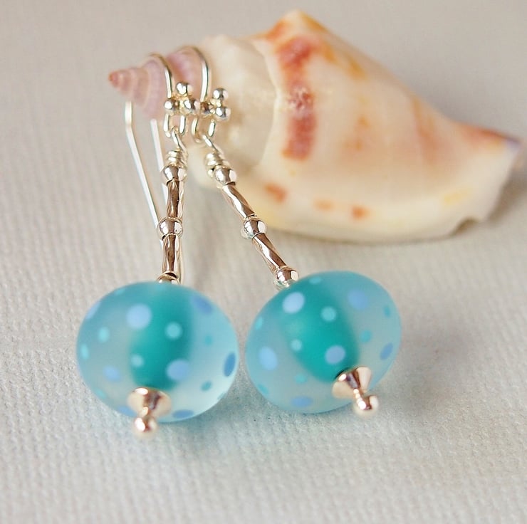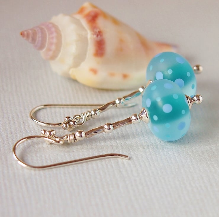 Handmade earrings featuring beautiful softly etched lampwork glass beads from the torch of Laura Sparling. They have a sea green core and have been encased in clear glass with surface dots in soft light grey.